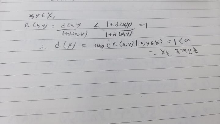 5. 문제에서 거리함수 e(답지는d_1이라 표기됨)를 유계거리라고 적고 끝맺었는데 그게 유계인 거리공간임을 어떻게 보인건가요?
