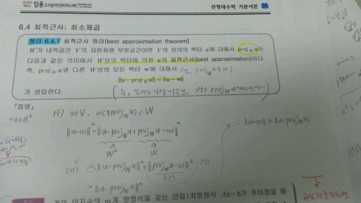 최적근사정리 질문입니다 작성자henoli|작성시간15.02.06|조회수954 목록 댓글 1 글자크기 작게가 글자크기 크게가 증명에서 "왜?"라고 표시한부분이 이해안가요왜 등호가 성립하나요?ㅠㅠ 다음검색 현재 게시글 추가 기능 열기 북마크 공유하기 신고 센터로 신고 댓글 댓글 1 댓글쓰기 답글쓰기 댓글 리스트 작성자심대원 | 작성시간 15.02.10 u-proj_W (u)는 W에 수직인 벡터이고, proj_W (u) - w는 W의 원소들의 차이므로 W에 포함된 벡터입니다. 즉, 두 벡터가 서로 수직이므로 피타고라스 정리를 적용할 수 있습니다. 댓글 전체보기