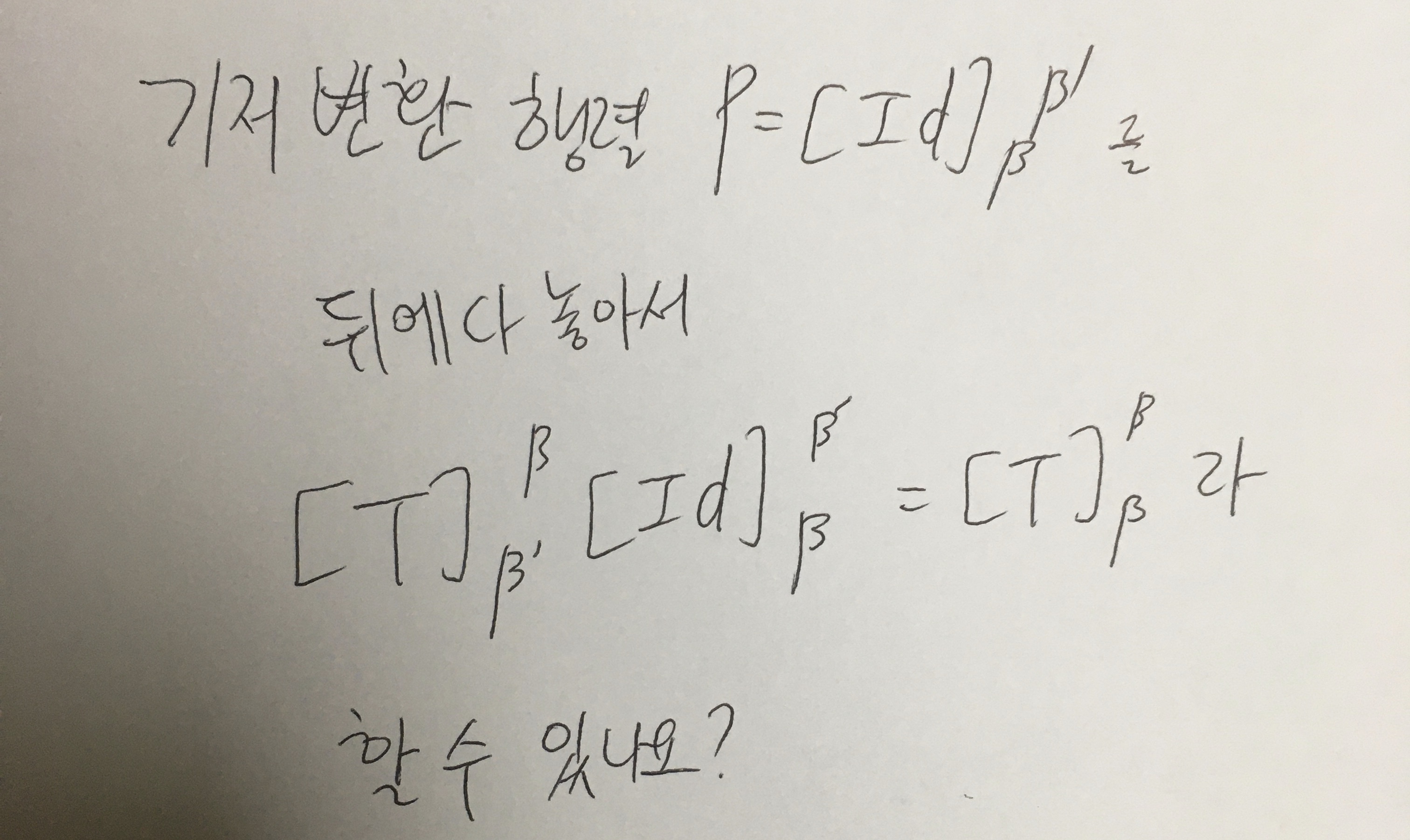 작성자수정과 작성시간 21.07.16 n차원 벡터공간 V와 m차원 벡터공간 W에 대해 B={u₁, ···, uₙ}와 B'={v₁, ···, vₘ}를 각각 V와 W의 기저라 할 때, 선형변환 T : V → W와 ∀x∈V에 대해 [T]_{B',B}[x]_{B}=[T(x)]_{B'}임을 이용하여 성립함을 알 수 있습니다. (22대비 선형대수학 이론 및 문제풀이 정리 5.5.1 p.112 또는 정리 5.5.2 p.114 참고)