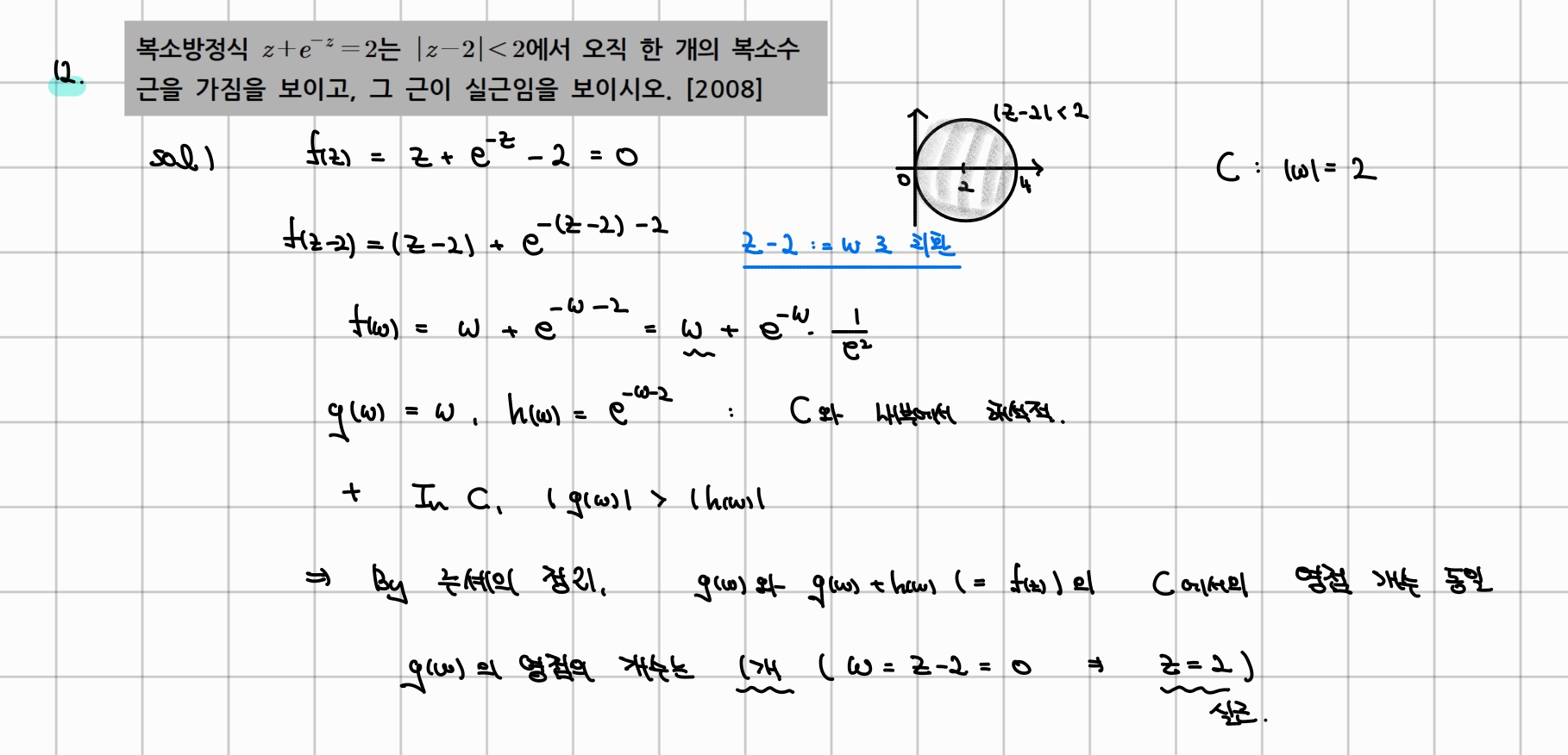 2026학년도 대비 : 유제 7 - 12 (루셰의 정리) 작성자황채환|작성시간25.12.16|조회수95 목록 댓글 1 글자크기 작게가 글자크기 크게가 풀이와 다르게 풀었는데.. 위 방식도 문제 없는걸까요? 다음검색 현재 게시글 추가 기능 열기 북마크 공유하기 신고 센터로 신고 댓글 댓글 1 댓글쓰기 답글쓰기 댓글 리스트 작성자수정과 | 작성시간 25.12.19 치환과 루셰 정리로 접근한 것은 괜찮지만 z=2로 결론 내린 것은 틀린 서술입니다. 루셰 정리는 g와 g+h의 근의 개수가 같다는 것을 알려주는 정리이지 g의 근이 g+h이 근이 됨을 보장해주는 정리가 아닙니다. 댓글 전체보기