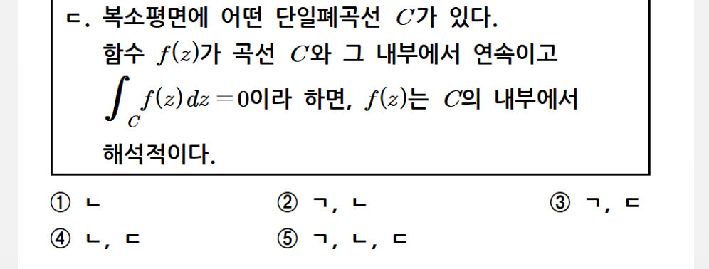 기출 작성자쥬쥬쥬|작성시간24.05.12|조회수49 목록 댓글 1 글자크기 작게가 글자크기 크게가 1.ㄱ에서 왜 y=o밖에서 해석적이어야하는지 궁금합니다2.ㄷ이 거짓인 이유가 궁금합니다....... 다음검색 현재 게시글 추가 기능 열기 북마크 공유하기 신고 센터로 신고 댓글 댓글 1 댓글쓰기 답글쓰기 댓글 리스트 작성자수정과 | 작성시간 24.05.13 ① 로그 함수의 으뜸 분지를 생각해준 것입니다. (25대비 복소함수론 필수예제 25, 정의 3.5 p.38 참고)② https://cafe.daum.net/math-hm/qw17/426 의 댓글을 참고해주세요. 댓글 전체보기