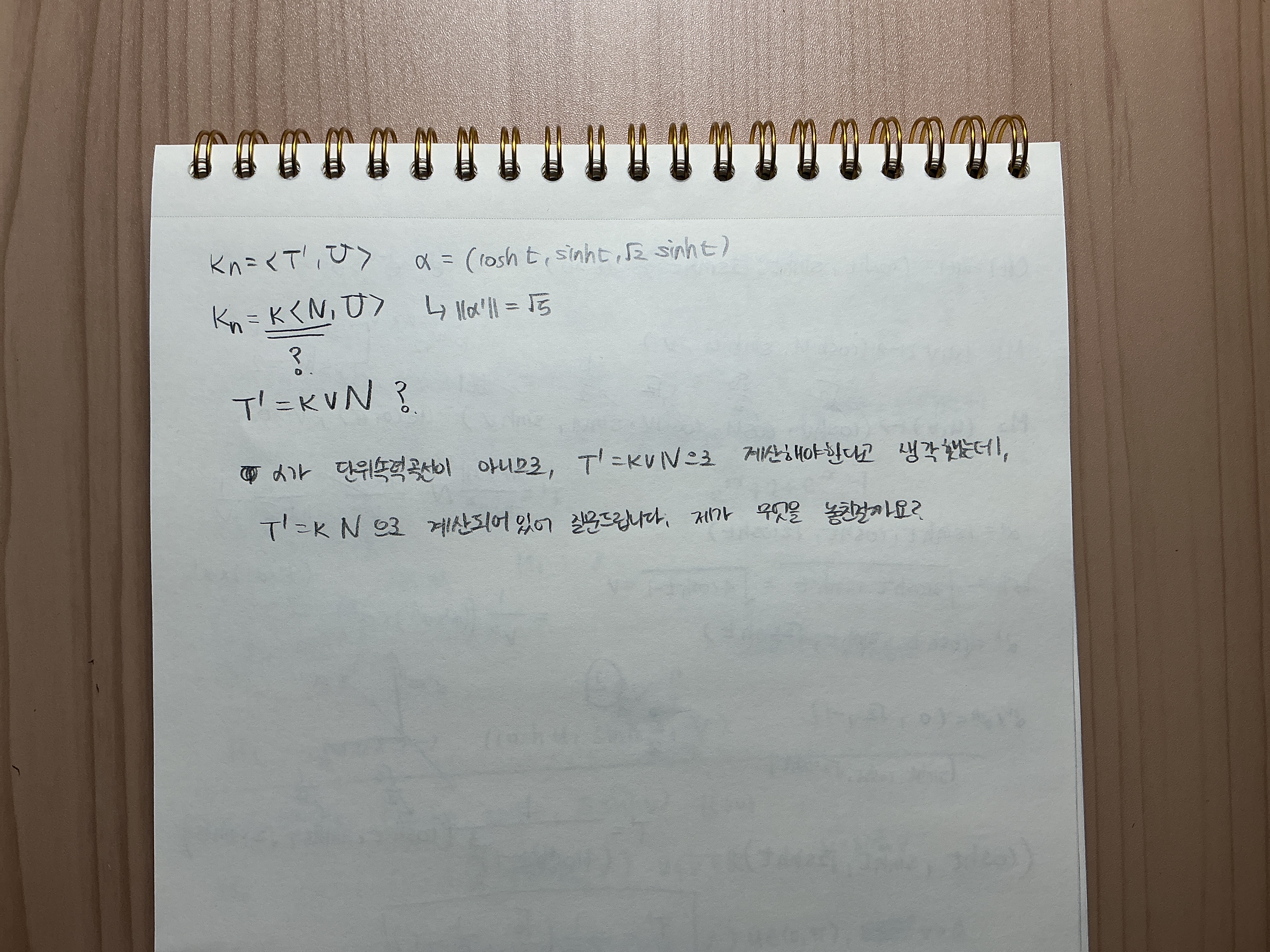 작성자수정과 작성시간 25.11.18 법곡률의 정의는 <T'(s), U>로 정의할 수 있습니다. 정칙곡선 α(t)에 대해 호장재매개화인 단위속력곡선을 β(s)=α(t(s))라 한다면 T_β(s)=T_α(t(s))이므로(26대비 미분기하학 정의 2.21 p.37 참고) T_(β)'(s)=T_(α)'(t(s))·(dt/ds)이므로 이를 법곡률의 정의에 적용하면 kn=<T_(β)'(s), U>=<T_(α)'(t(s))·(dt/ds), U>=<T_(α)'(t(s)), U>/v가 성립합니다.