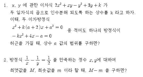 작성자시골장터 작성시간 09.06.26 M과 m이 합인지 곱인지 아님 다를 건지는 모르겠네요...통분해서 인수분해하면 (x-2)(y+2)=-4가 나옵니다. 해를 구하면 (6, -3), (4, -4),...(1, 2) 5쌍이 나옵니다...