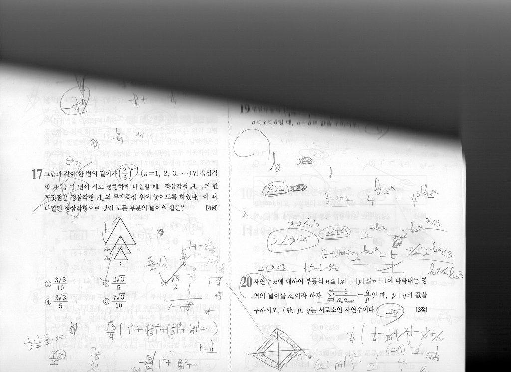 17. 닮음비 1:2/3 , 넓이비 1:4/9 이고 첫항: (root3 /4)*8/9이므로 (root3 /4) * 8/9 / (1-4/9)= 2 root3 /5