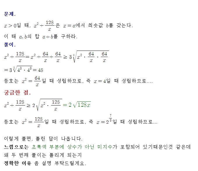 작성자리만가설 작성시간 10.07.29 많은 학생들이 산술기하의 조건을 하나만 알고 있는것 같은데요ㅎ 산술기하를 쓸 수 있는 조건은 1)양수일때 2)합이나 곱 둘중에 하나가 일정할때 쓸 수 있습니다. Dewdrops님께서 하신 두번째 풀이는 변수를 x^2 128/x로 놓으면 합과 곱 둘다 일정하지 않죠. x ≥y 이렇게만 있으면 y의최대x의최소값을 알수가 없습니다. x≥1 이렇게 있어야 x의 최대값을 구할수 있습니다~ 열공하세요^.^