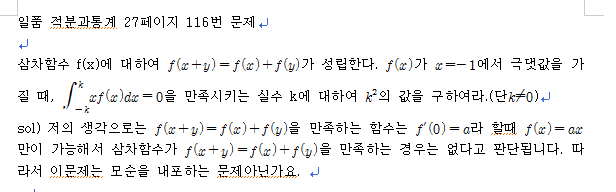 작성자수학111 작성시간 11.12.06 주어진 조건은 선형성이라 볼 수 있고 위와 같은 성질을 갖는 다항함수는 일차함수밖에 존재하지 않습니다.문제가 옳기위해서는 정답이 주어진조건을 모두 만족해야한다고 생각합니다