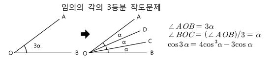 예를 들어 90°를 삼등분 하라는 것은 30°를 작도할 수 있느냐는 문제 것인데 cos(30°)가 작도수 이냐는