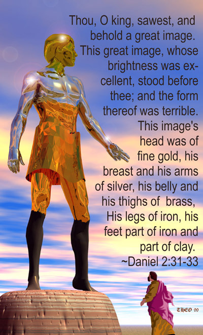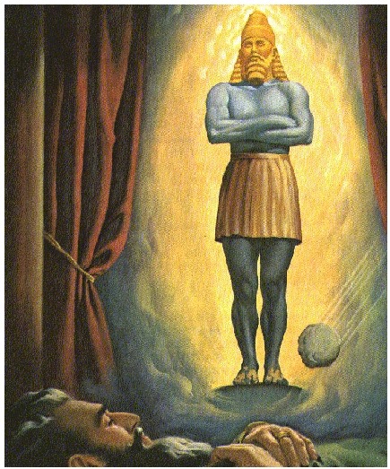 느부갓네살 왕은 꿈속에서 아래와 같은 큰 우상을 보았던 것이다. 그 우상은 금속으로 이루어져 있으므로 광채가 특심하였는데, 신상의 모양은 그 크기와 빛남으로 인해 매우 큰 두려움을 자나내게 하였다.