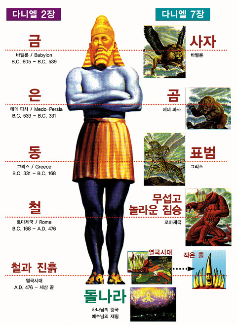다니엘 2장의 예언은 다니엘 당시부터 예수 그리스도의 재림으로 하나님의 나라가 건설될 때까지의 세계사의 대요가 예언으로 계시된 것이었다. 다니엘 7장의 예언은 다니엘 2장의 예언과 같은 내용이 다른 모양으로 계시된 것이다.
