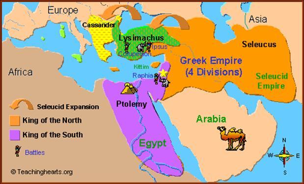 이 표범이 지닌 네 머리는 세 번째 나라인 그리스가 4분 될 것을 가리키는 것인데, 역사적으로 그리스는 알렉산더 사후에 부하 장군들의 세력 다툼으로 전 국토가 정확히 넷으로 분할되고 말았다. 다음은 그 네 장수가 차지한 영토들이다.