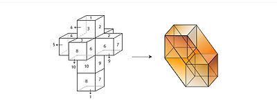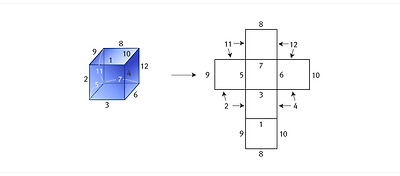 3차원인 정육면체를 평면에 정확하게 표현하는 방법 가운데 하나는 전개도를 그리는 것이다. 다음 그림과 같이 정육면체의 모서리를 분해하여 펼쳐놓으면 2차원 평면이 되며, 전개도에는 모든 각이 직각인 완벽한 정사각형 6개가 나타나게 된다. 이때, 정육면체의 각 모서리가 전개도의 어느 정사각형과 접하게 되는지 알려면 각 모서리에 1부터 12까지 번호를 붙여 전개도에 나타내면 된다.