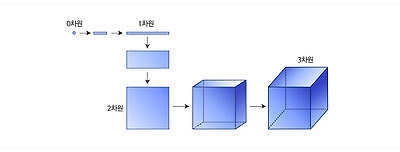 우선 0차원부터 시작하여 차례로 4차원까지 엄격한 학문적인 정의보다는 직관적인 생각으로 차원을 확장해 보자. 수학에서 0차원은 점이다. 즉, 움직일 수 있는 방향이 한 곳도 없고 단지 위치만 차지하고 있다. 이제 이 점에 잉크를 채워서 한 방향으로 일정하게 늘리면 선분이 된다. 즉, 1차원 도형인 선분을 얻을 수 있다. 마찬가지 방법으로 선분에 잉크를 채우고 수직 방향으로 일정한 길이로 끌면 다음 그림과 같이 2차원 도형인 정사각형이 된다. 다시 2차원 정사각형에 잉크를 채우고 수직 방향으로 일정한 길이를 끌면 3차원 도형인 정육면체가 된다.