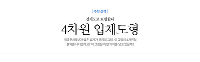 또 살바도르 달리는 1954년에 [십자가에 못 박힌 예수-초입방체 Crucifixión / Corpus Hypercubus] 라는 작품에 4차원 입체도형의 전개도를 그려 넣었다. 그러나 수학을 전공하지 않은 사람은 그의 작품 속에서 4차원의 입체도형을 찾을 수 없을 것이다. 단지 십자가 모양으로 쌓여있는 8개의 정육면체에 못 박힌 예수님을 볼 수 있을 것이다. 이 세 화가의 작품 가운데 달리의 작품은 추상적이지 않은 것처럼 보이기 때문에 쉽게 이해할 수 있을 것 같다. 과연 어디에 4차원이 숨어 있을까?