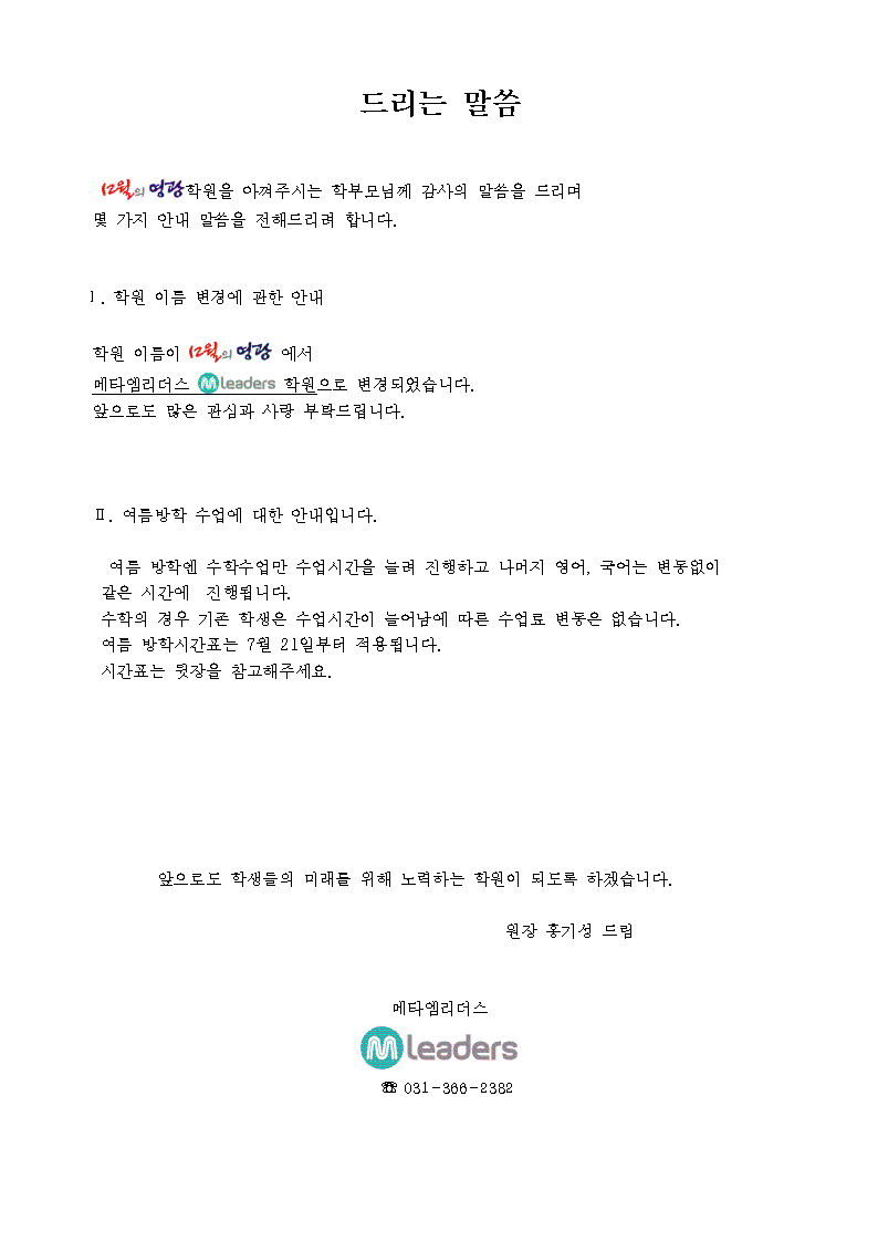 여름방학 안내문입니다.~ 작성자메타엠리더스|작성시간14.06.29|조회수467 목록 댓글 0 글자크기 작게가 글자크기 크게가 여름방학안내문(통합).hwp 첨부파일첨부된 파일이 3개 있습니다. png 파일 여름방학안내문(통합1)001.png 다운로드 png 파일 여름방학안내문(통합1)002.png 다운로드 hwp 파일 여름방학안내문(통합).hwp 다운로드 다음검색 현재 게시글 추가 기능 열기 북마크 신고 센터로 신고 댓글 댓글 0 댓글쓰기 답글쓰기 댓글 리스트