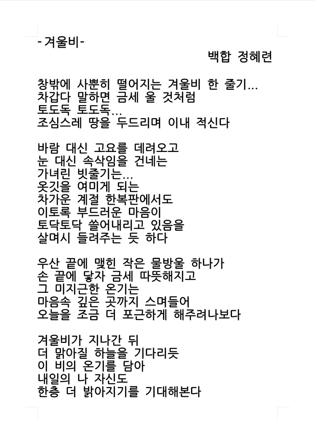 창밖에 사뿐히 떨어지는겨울비 한 줄기...