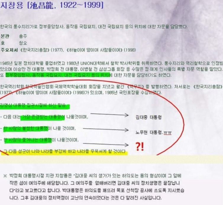 예전에 하회탈같이 생긴 대통령이 세상을 바꾼다는 예언이 있었죠 그말이 지금와서 생각해 보니 결국 그 결론은 문재인까지 연결이 되어 세상을 바꿀 수 있을 거 같습니다. 노무현이 꿈꾸던 세상을 완결지어 줄 가장 완벽한 원칙주의자인 문재인... 그는 자기 자신은 정치와는 맞지 않는다고 생각하고 정치를 하고 싶어하지 않았습니다. 그러나 노무현의 죽음이 결국 그를 놓아주지 않고 다시 정치에 뛰어들게 했죠. 그 운명대로 그 순리대로 결국 그는 뚜벅뚜벅 걸어가고 있습니다. 김영삼 시절 지창용 박사의 예언이 정교하게 맞아 떨어지는 게 새삼 놀랍습니다. 전 이명박이 임기를 다 채우지 못할 대통령으로 보고 있었는데 임기를 다채워서 그 예언은 틀렸다고 생각했지만 이명박은 언급할 가치가 없었던 건지 빠져 있었다고 추정됩니다. 아래 사진은 박근혜가 탁핵 되기 훨씬 전에 책 내용에 주석을 달아 놓은 자료입니다. 자 이제 가장 가슴 따뜻하고 가장 멋진 최고의 대통령의 시대를 우린 같이 살게 되었습니다. 축하드립니다. 생각만 해도 가슴이 벅차 오릅니다.