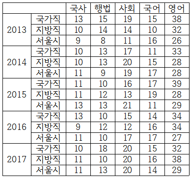 참고를 위해 필자가 친 주요 필기시험의 실제 시험시간을 같이 올려둔다. 필자의 경우 영어는 30분을 넘길 수밖에 없다고 생각했고, 사회와 국어도 15분을 넘기는 경우가 많았다. 그래서 표준 시간대를 넘어가는 과목을 줄이는 것도 노력했지만, 국사와 행정법을 최대한 빨리 푸는 것에 더 신경을 썼다. 여기서 ‘최대한 빨리 푼다’는 것은 난이도가 어렵게 나오더라도 안정적인 풀이시간대를 확보하는 것을 의미한다.