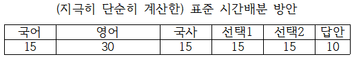 그럼 어느 정도로 빨리 풀어야 할까? 개인마다 다소 차이는 있겠지만 최대한 일반적으로 생각해보자. 일단 100분 중 10분은 OMR답안지 마킹을 비롯한 여유시간으로 남겨둔다. 그럼 90분이 남는다. 영어를 30분 푼다고 가정하면 60분이 남고 이를 나머지 4과목에 고르게 분배하면 각 과목당 15분 안에는 풀어야 한다는 계산이 나온다.