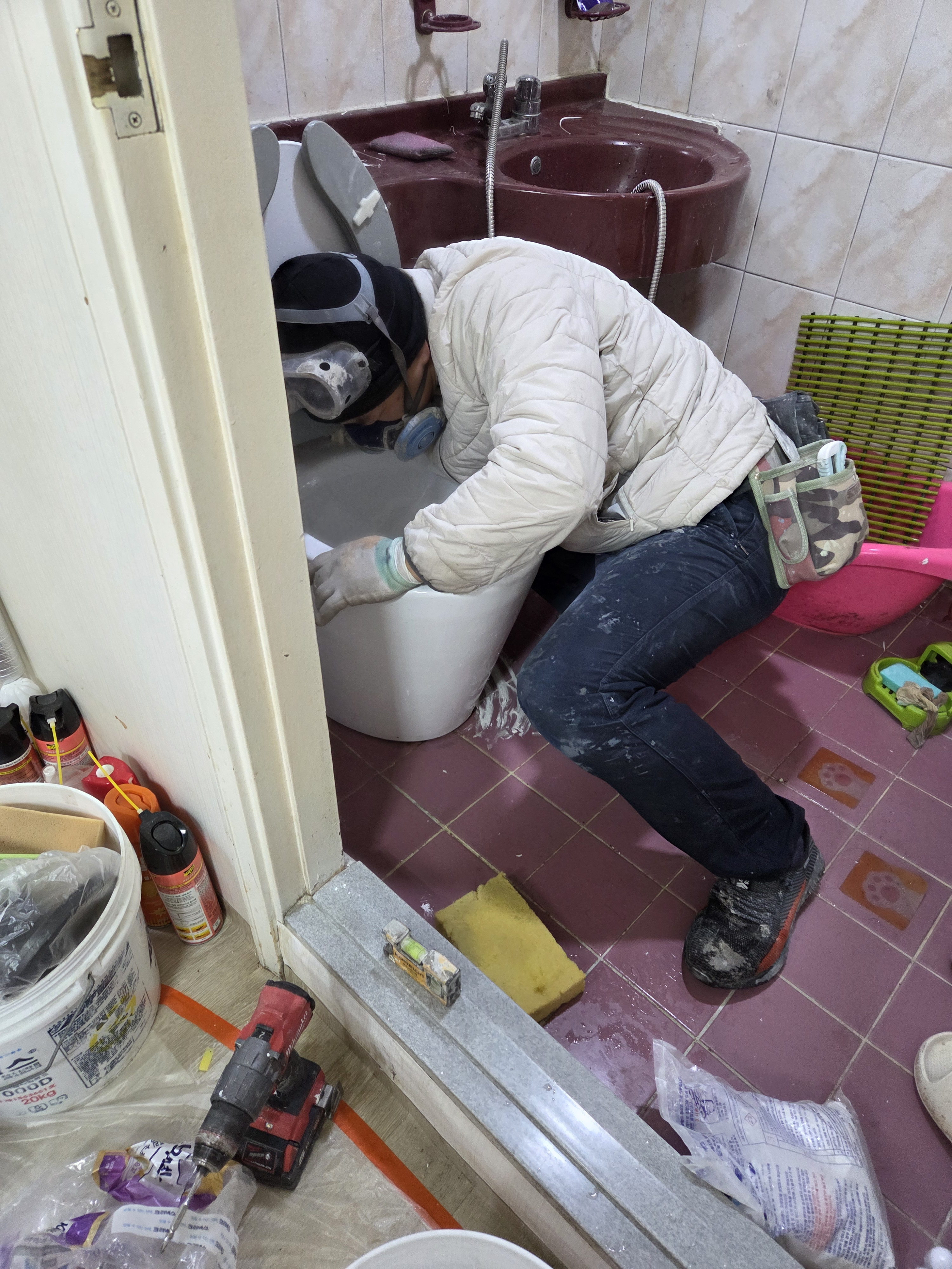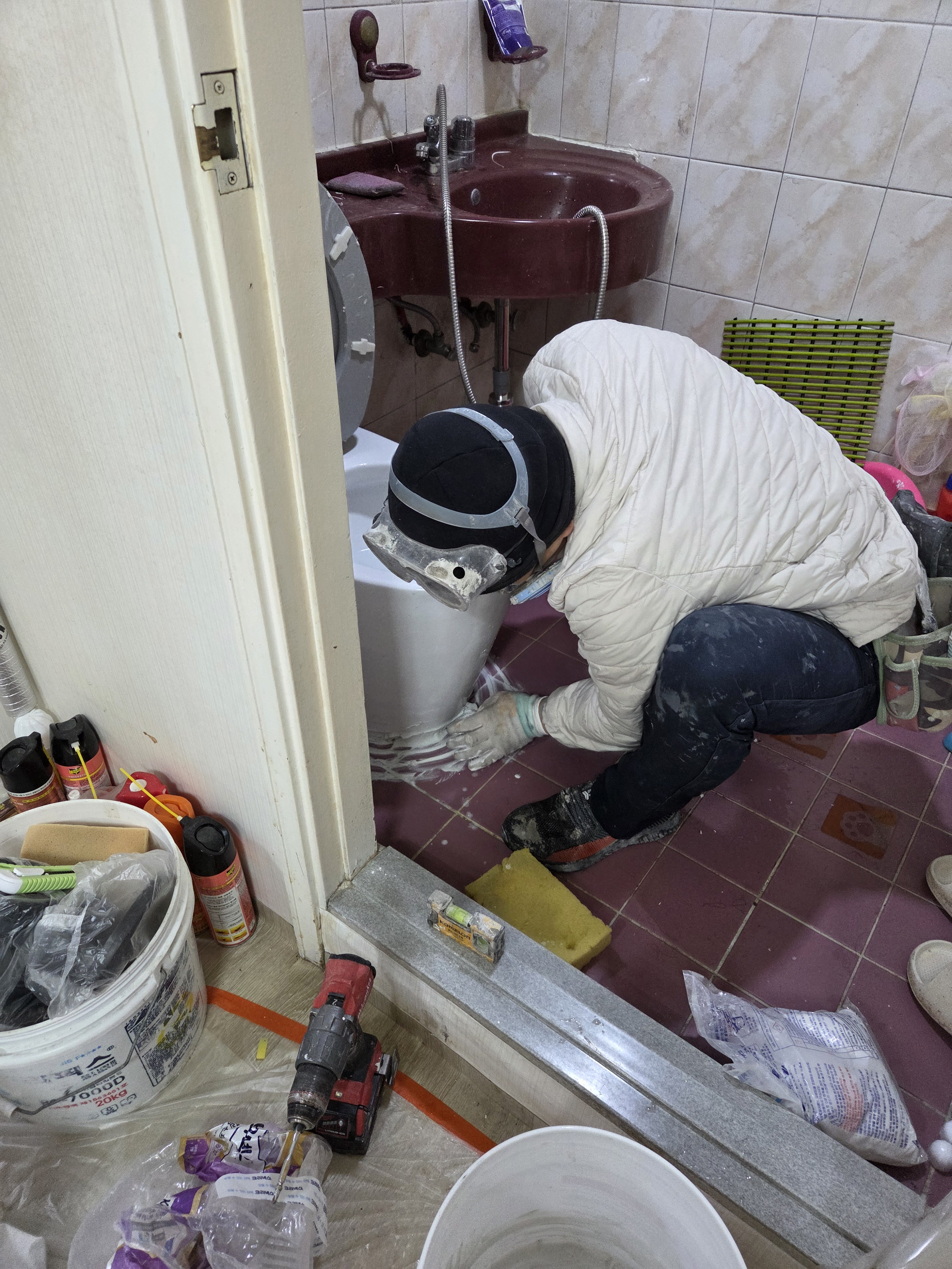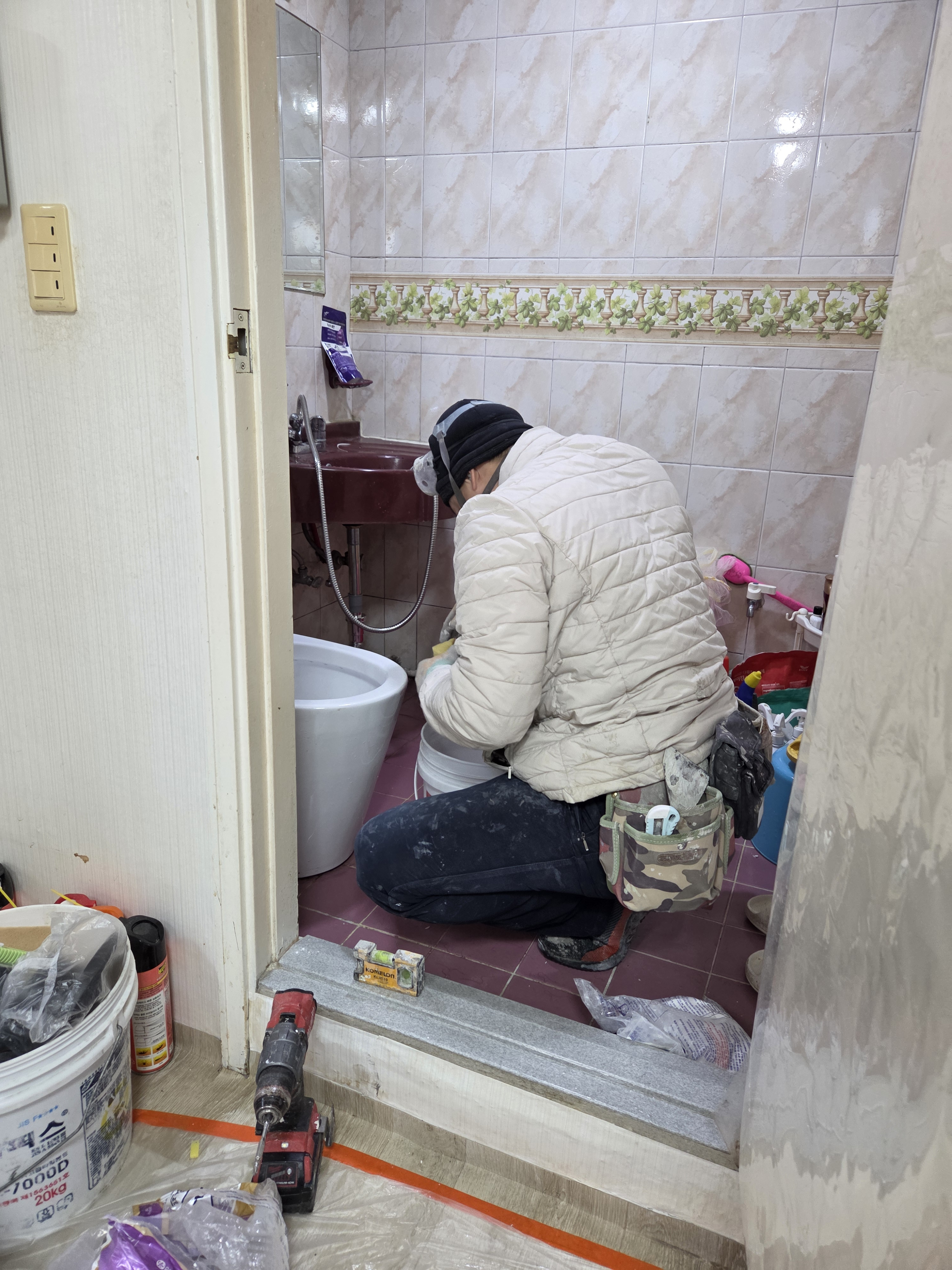 변기는 물이새서(후렌지 없이 시공하여 발생한 문제) 다시 놓아드리기로 했습니다.