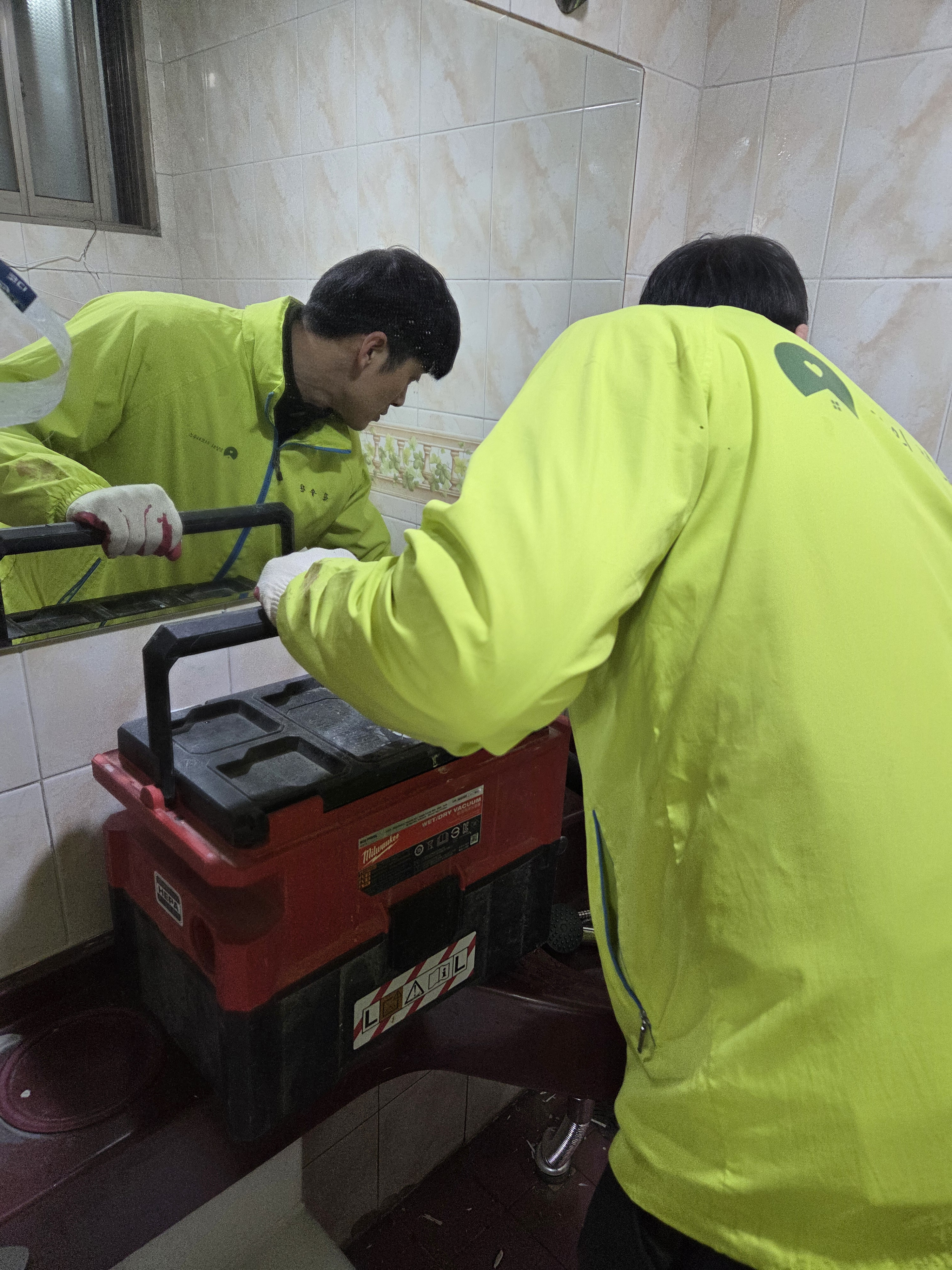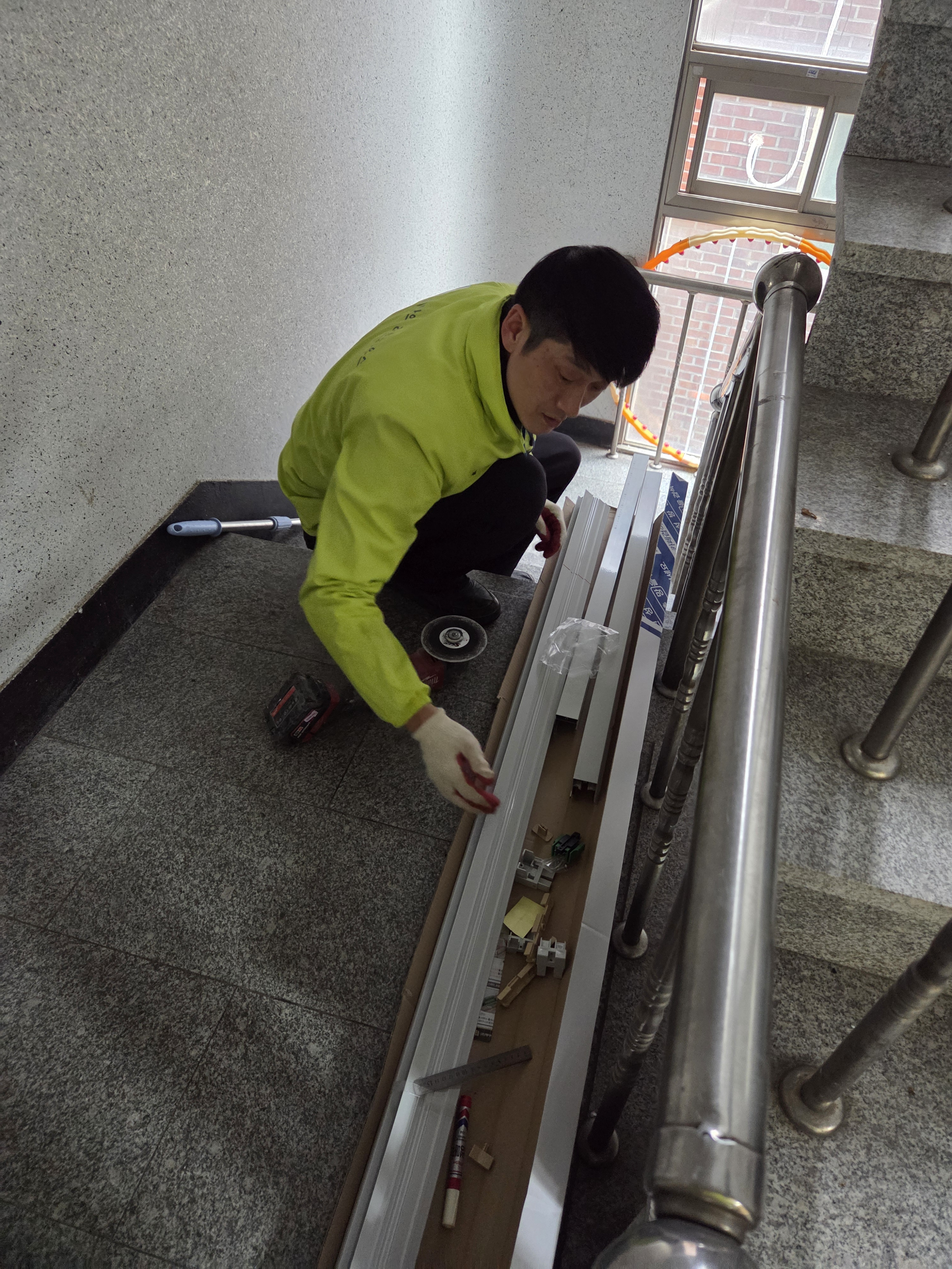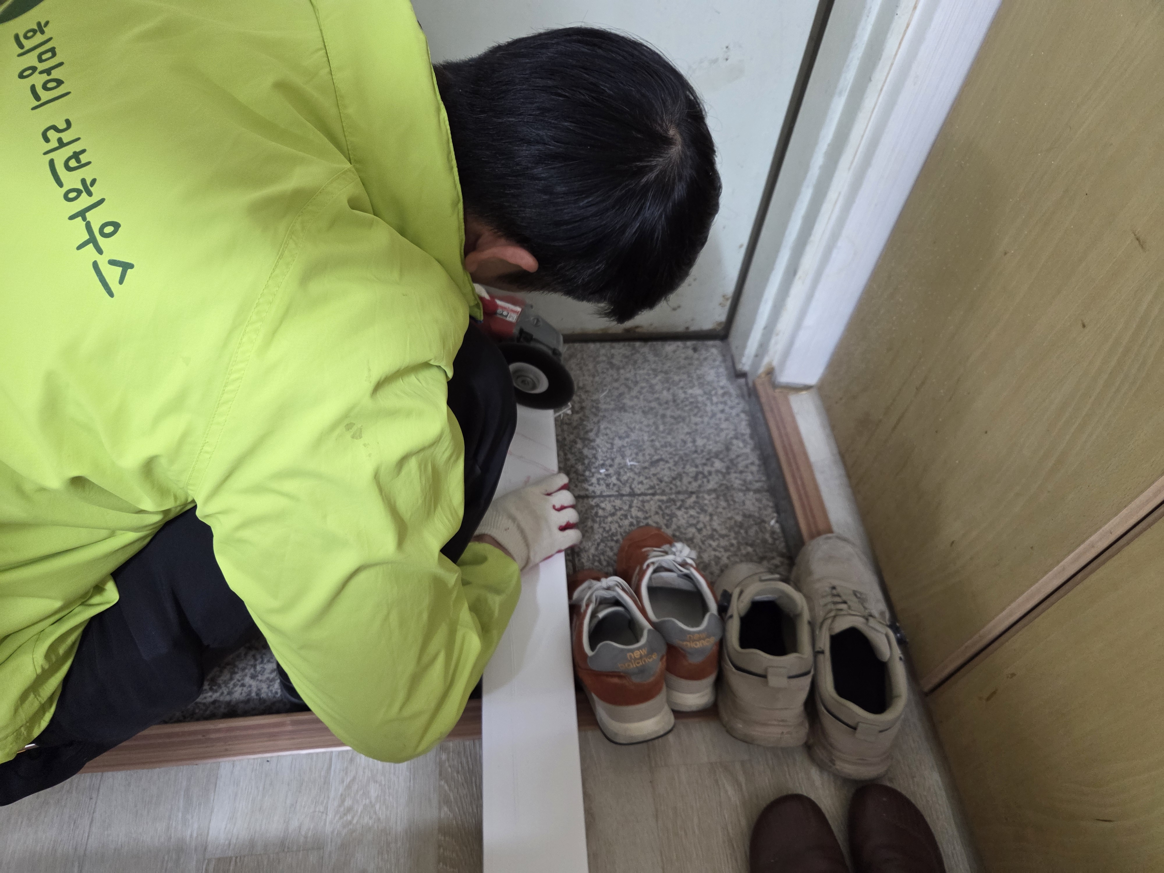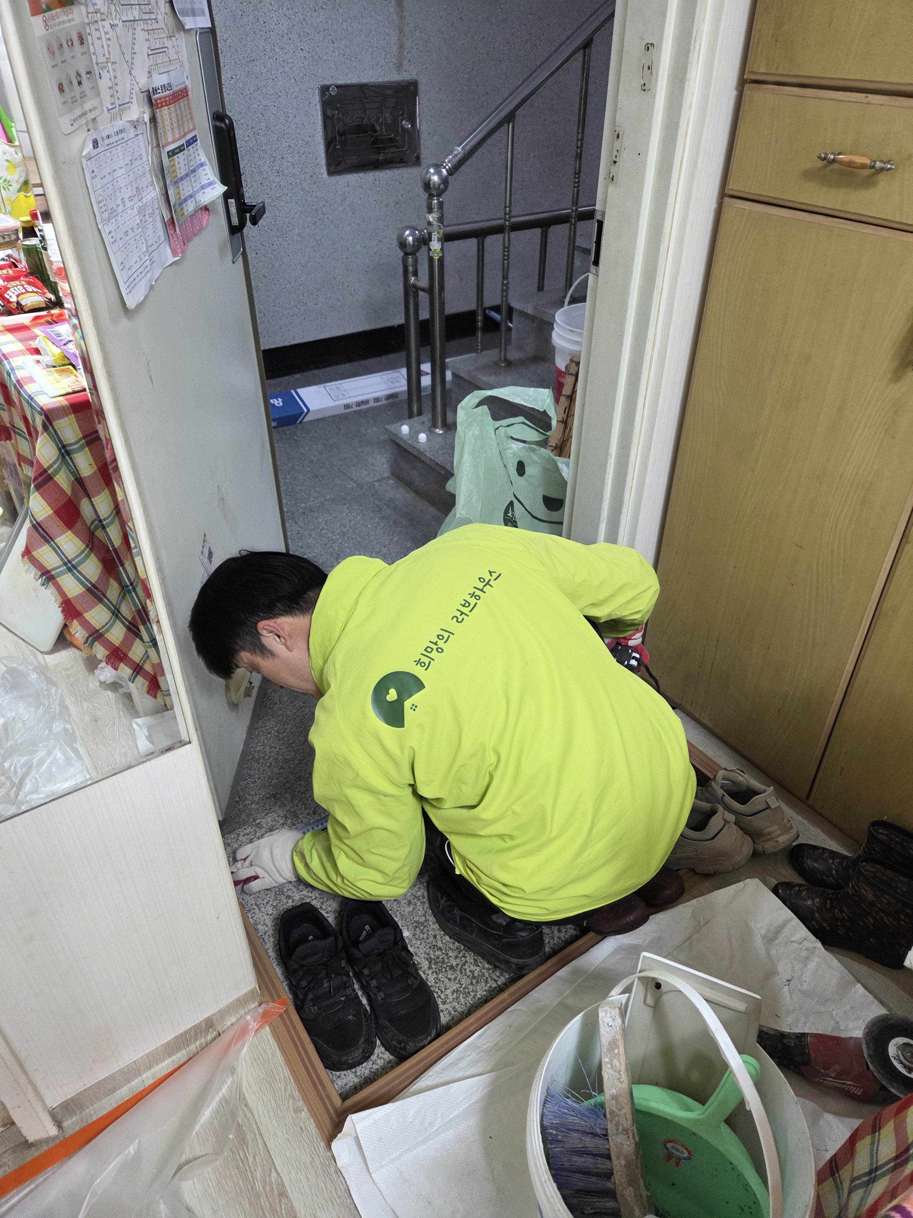 첫번째 가정에서 조편성 후 연장과 자재를 챙겨 이동하여 작업을 시작합니다.