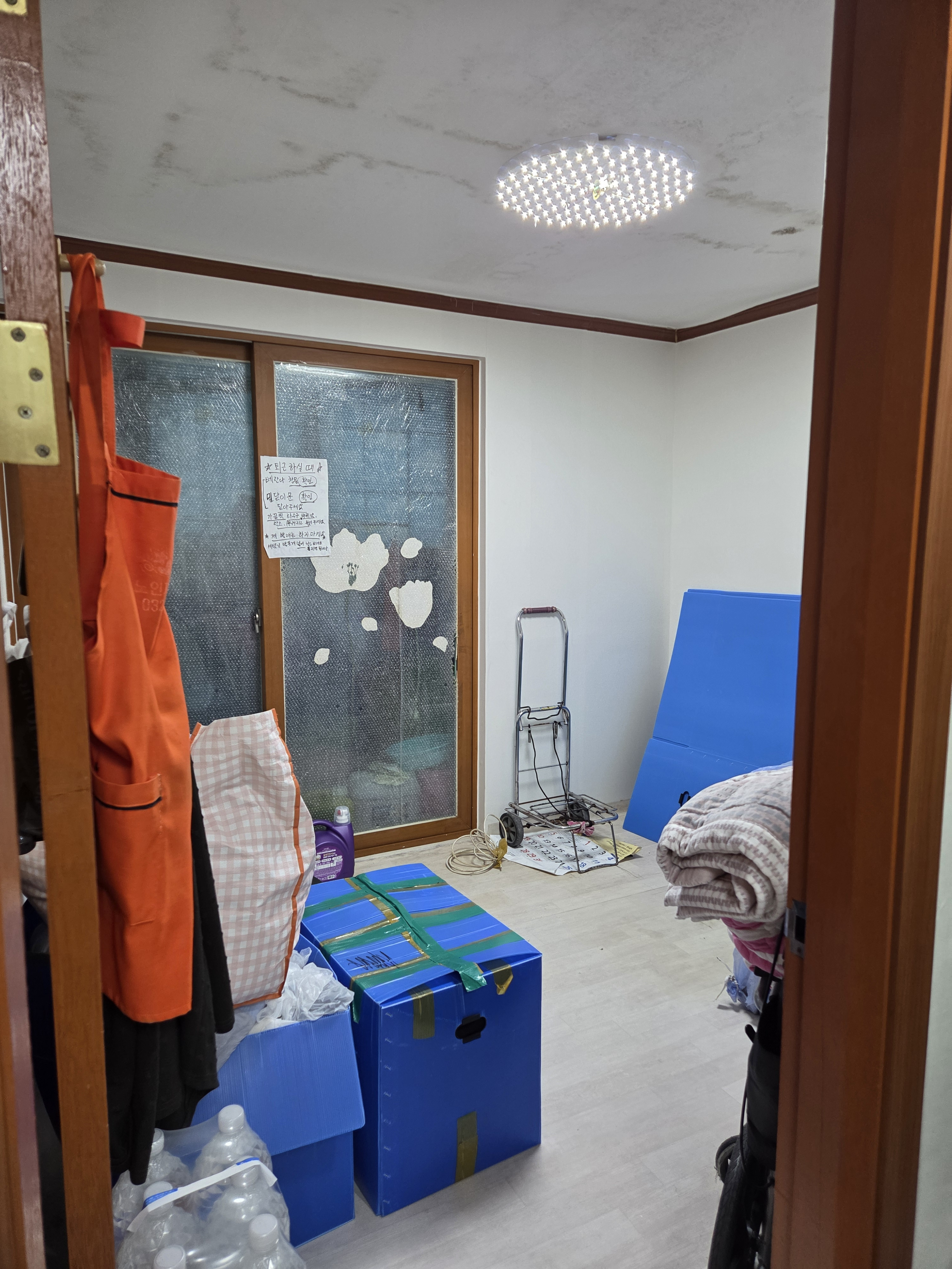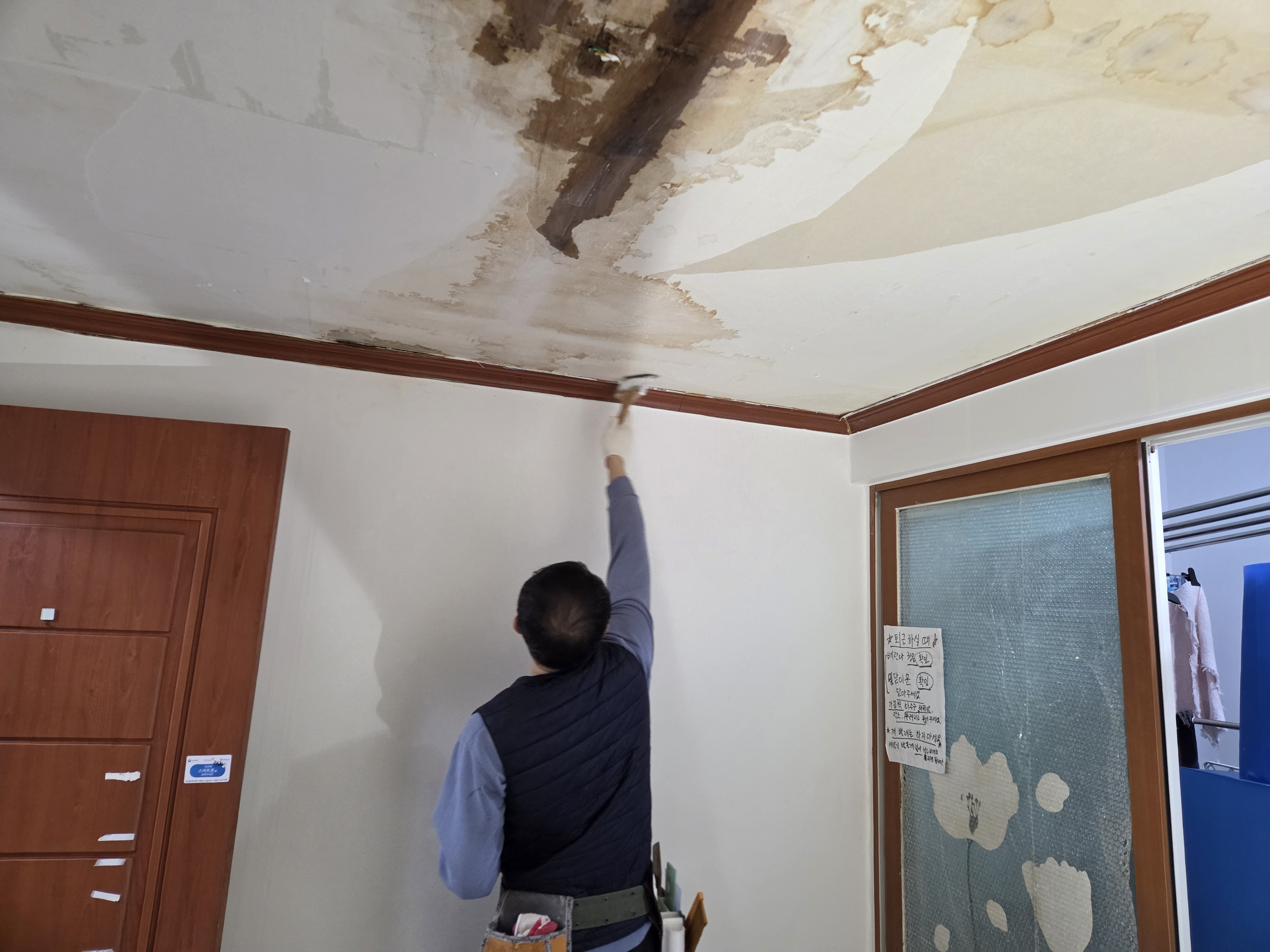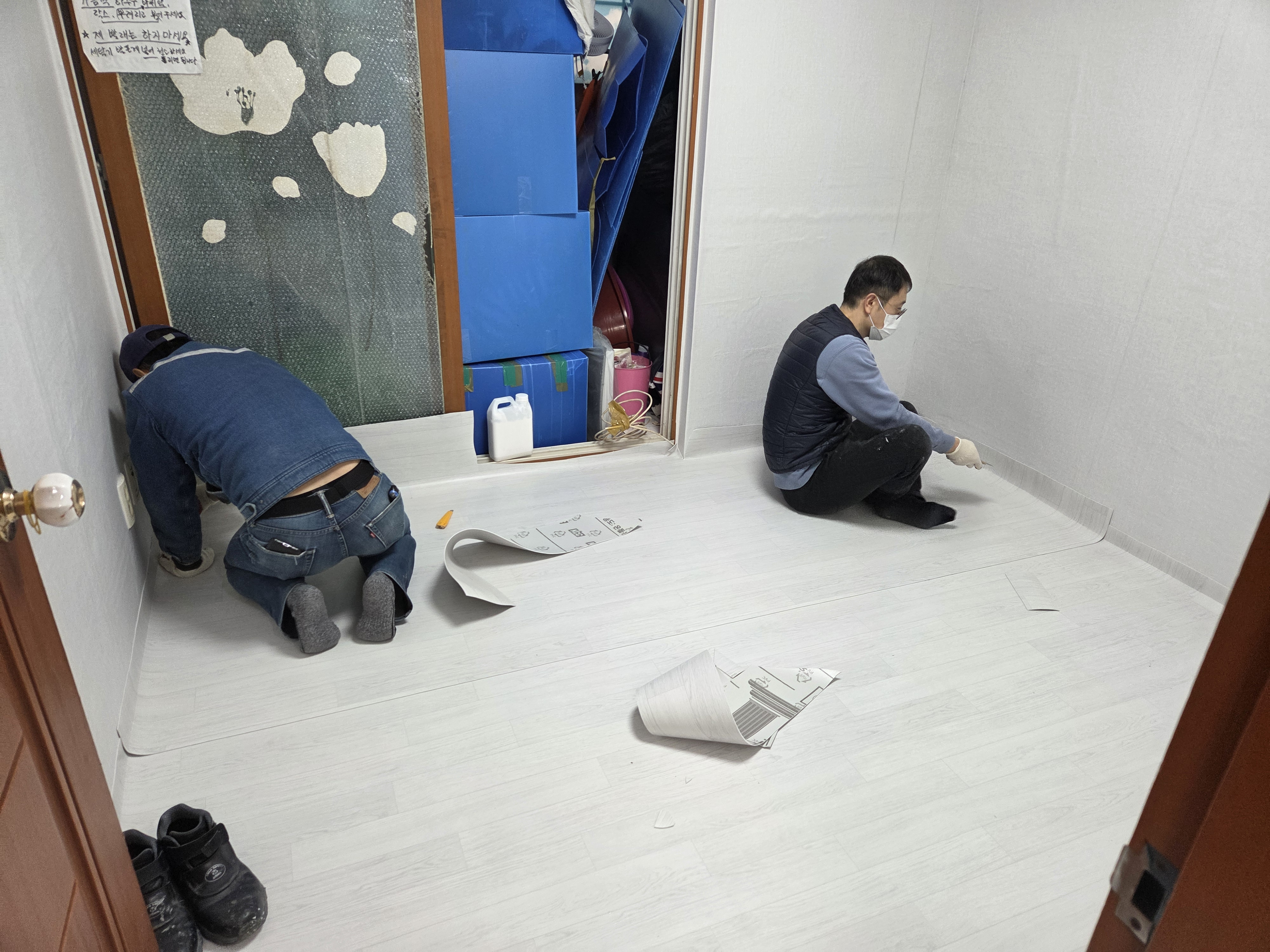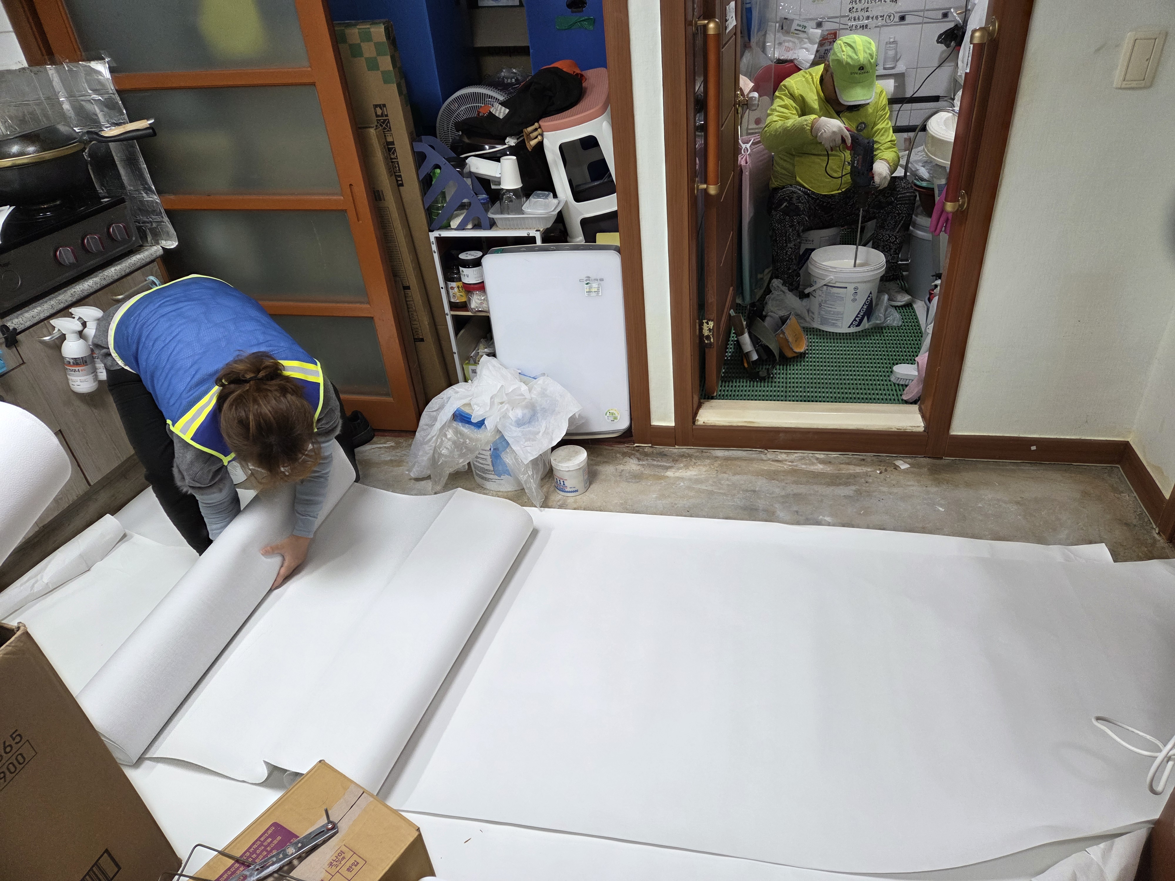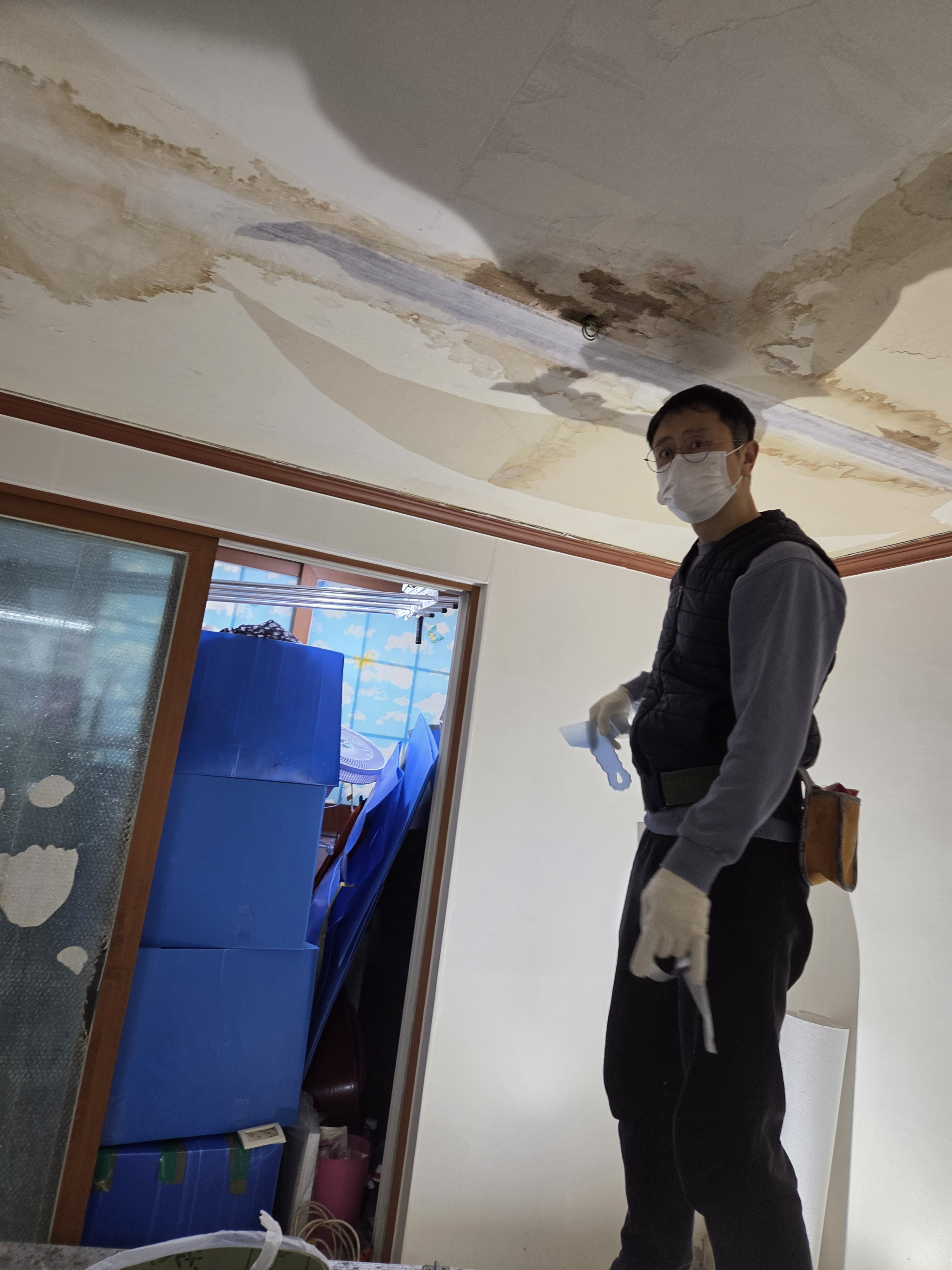 할머니가 누워계시는 방은 누수가 없어서 누수가 난 방 도배/장판과 거실 장판 작업. 그리고 화장실 천정 도배를 진행했습니다.