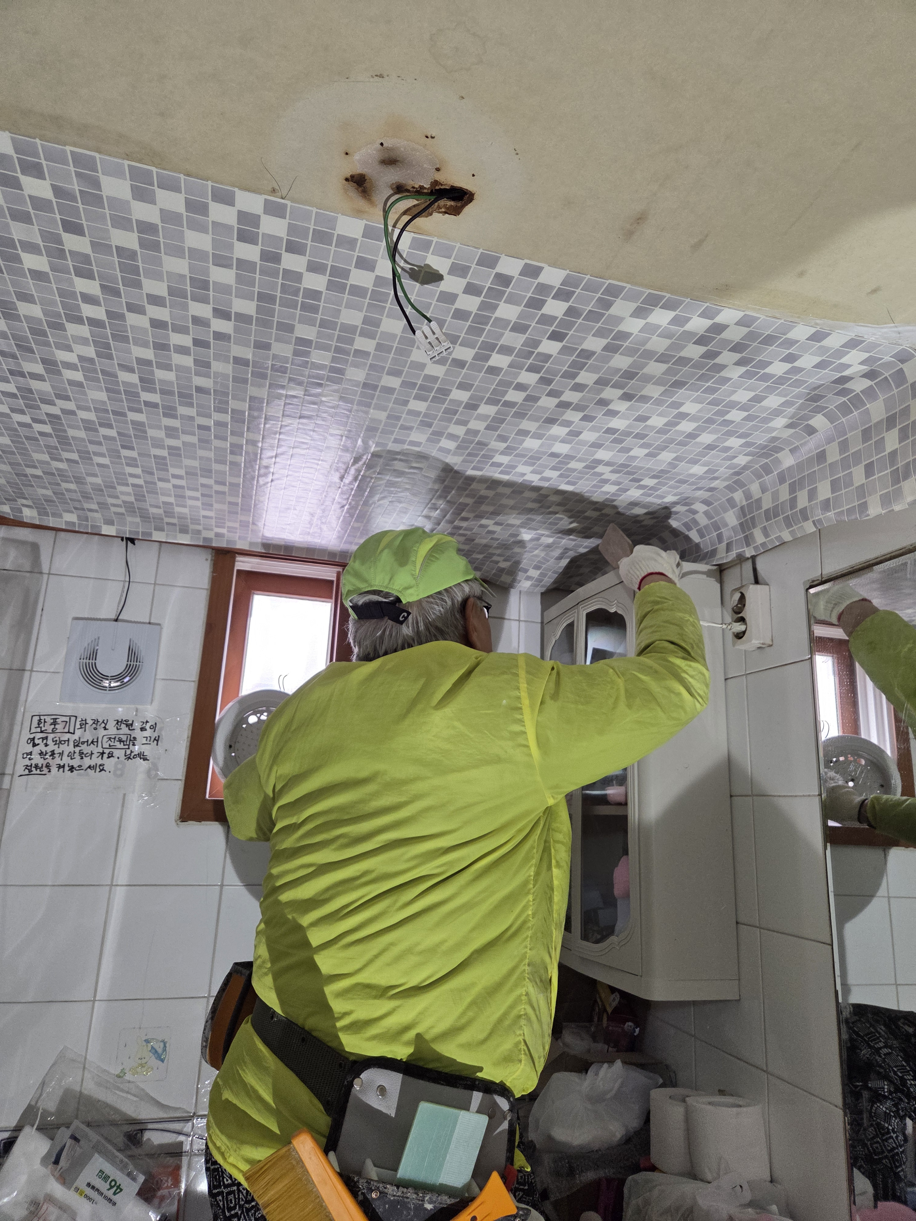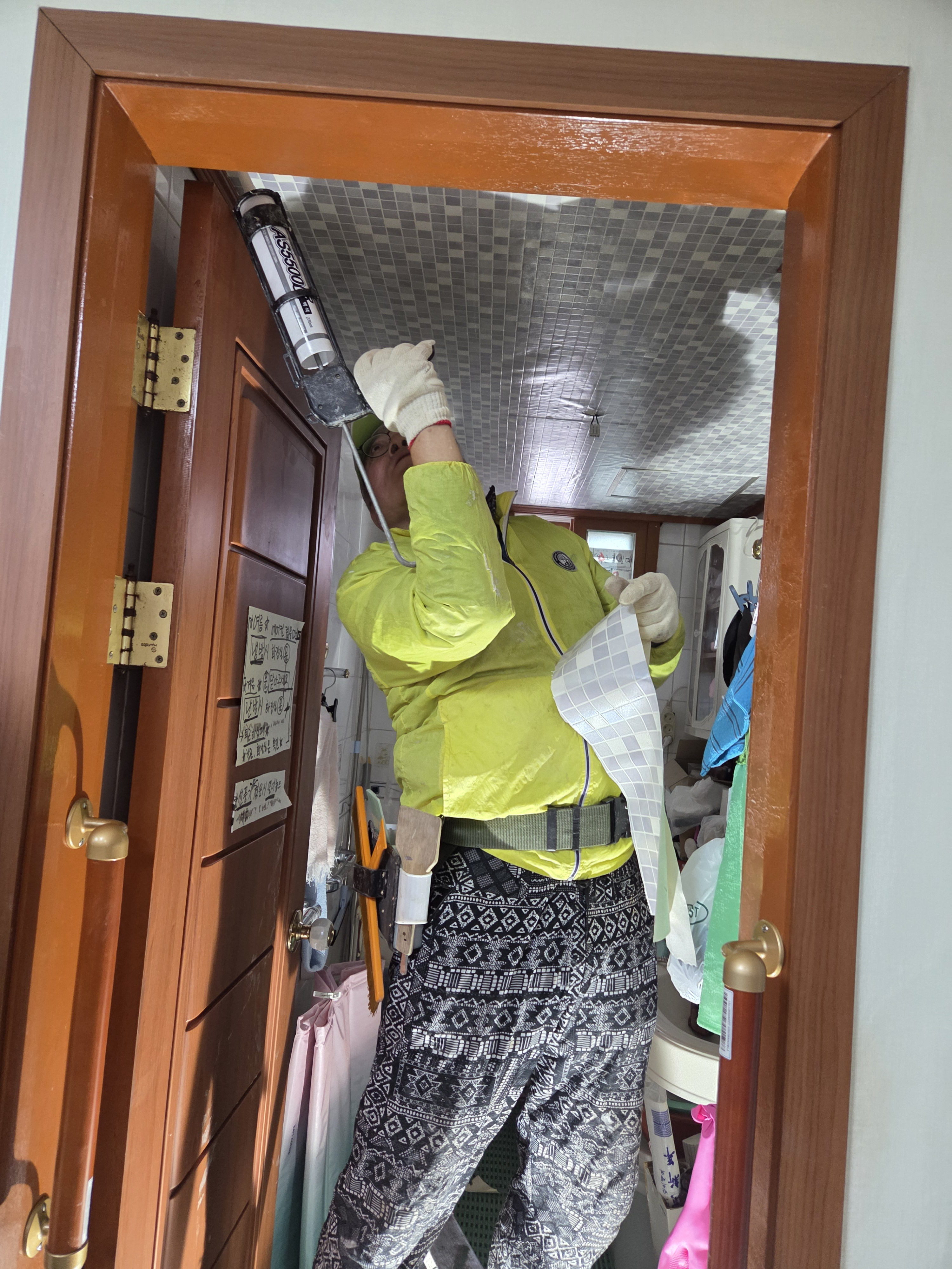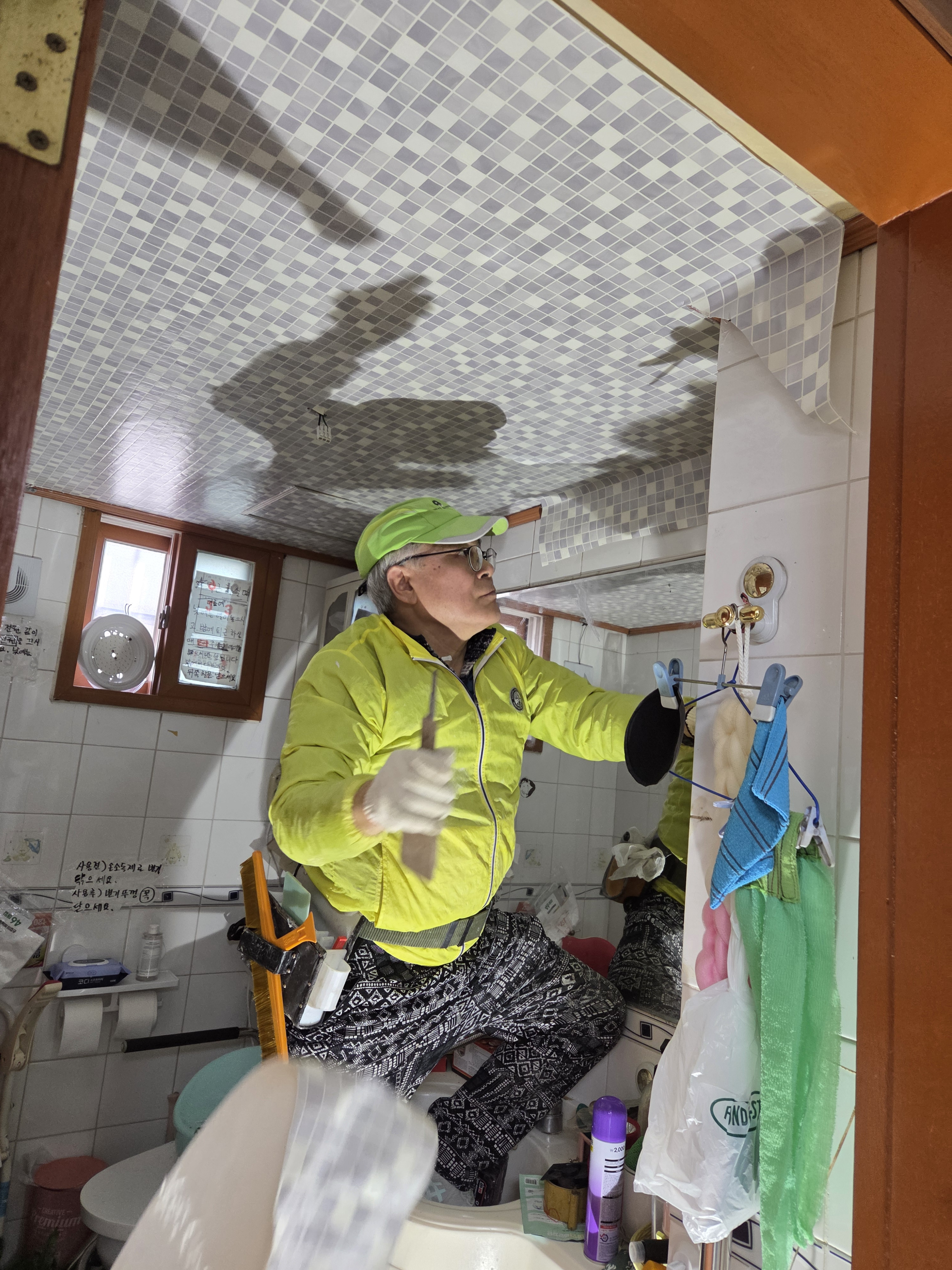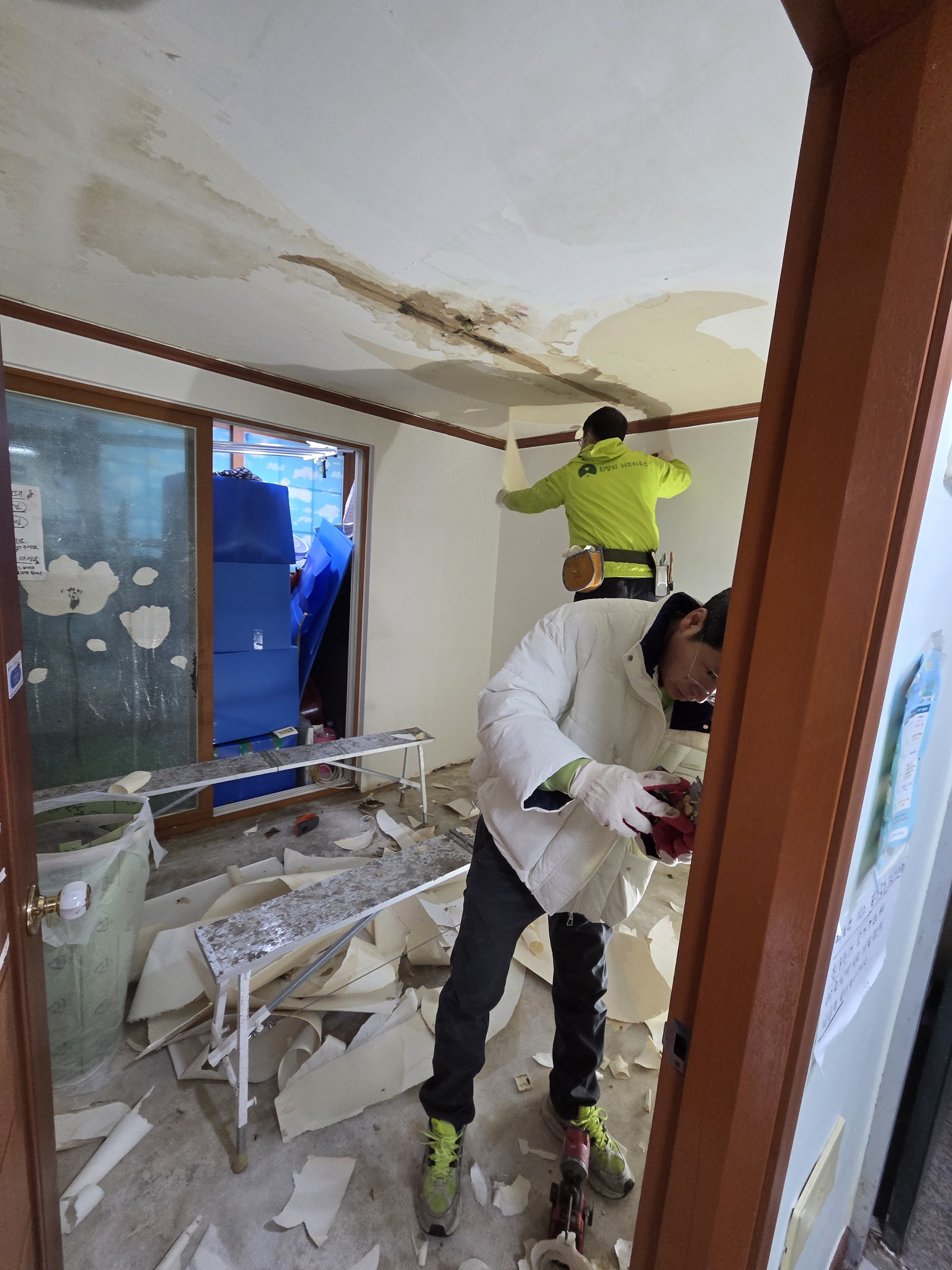 할머니가 누워계시는 방은 누수가 없어서 누수가 난 방 도배/장판과 거실 장판 작업. 그리고 화장실 천정 도배를 진행했습니다.