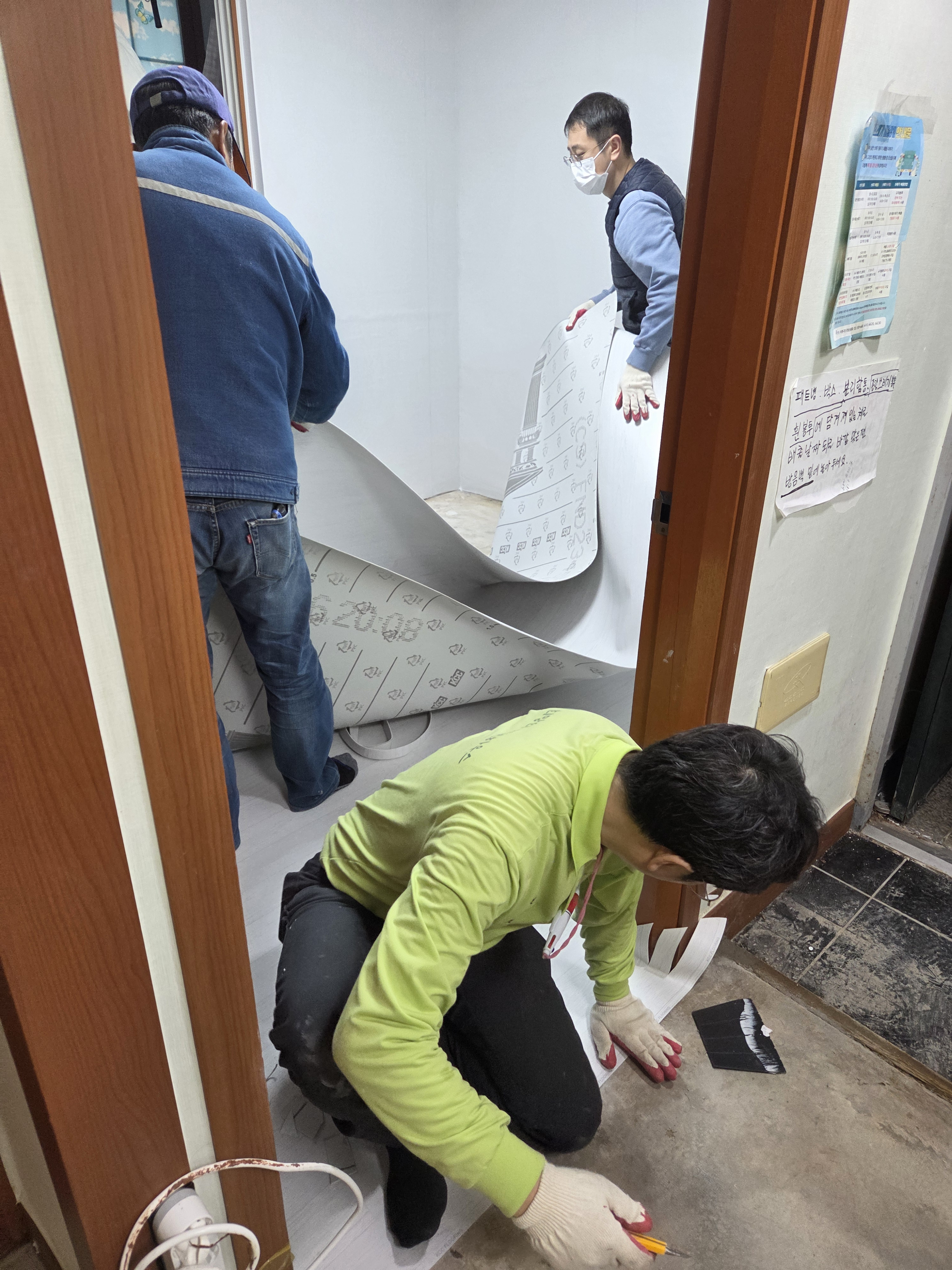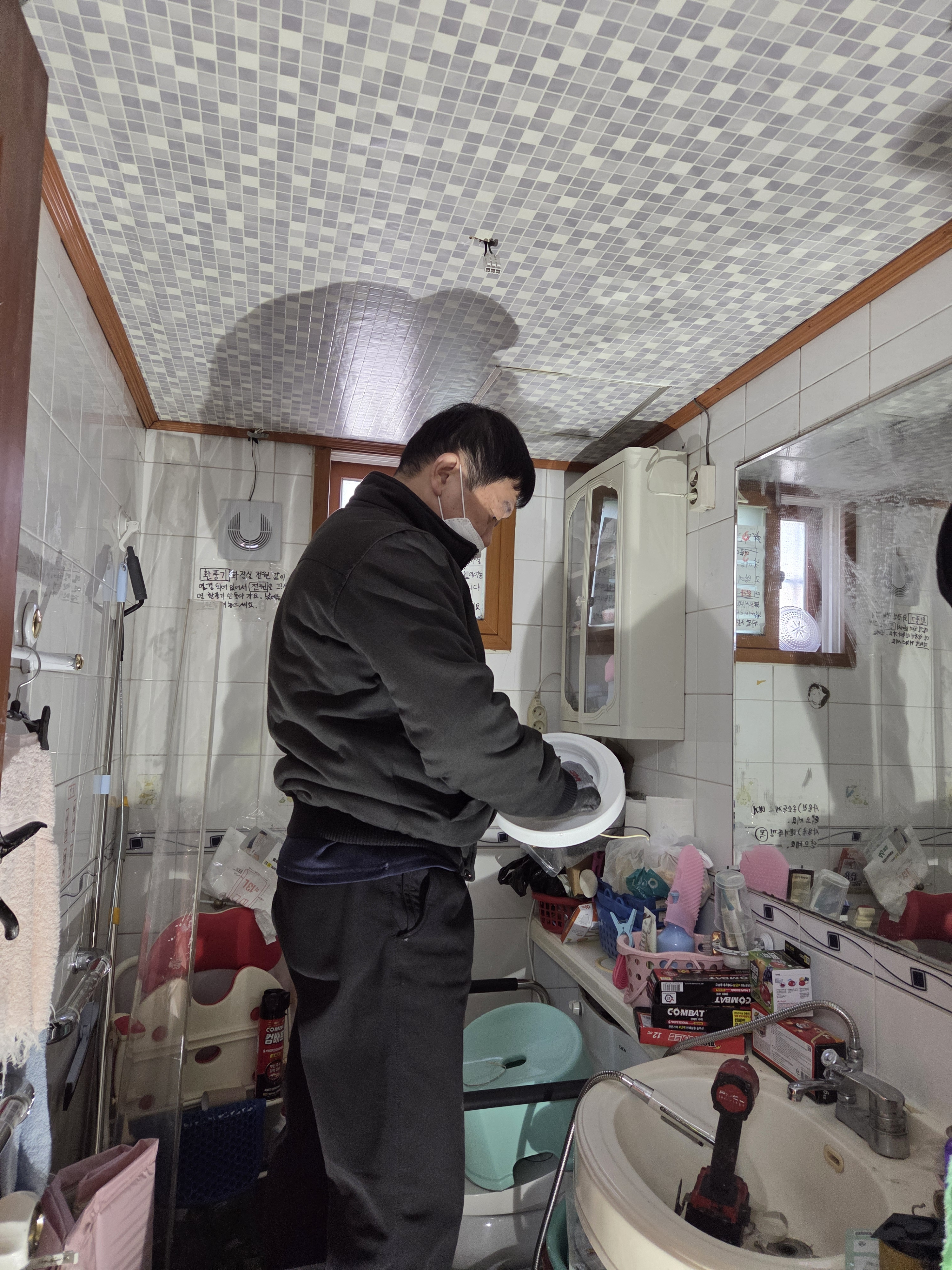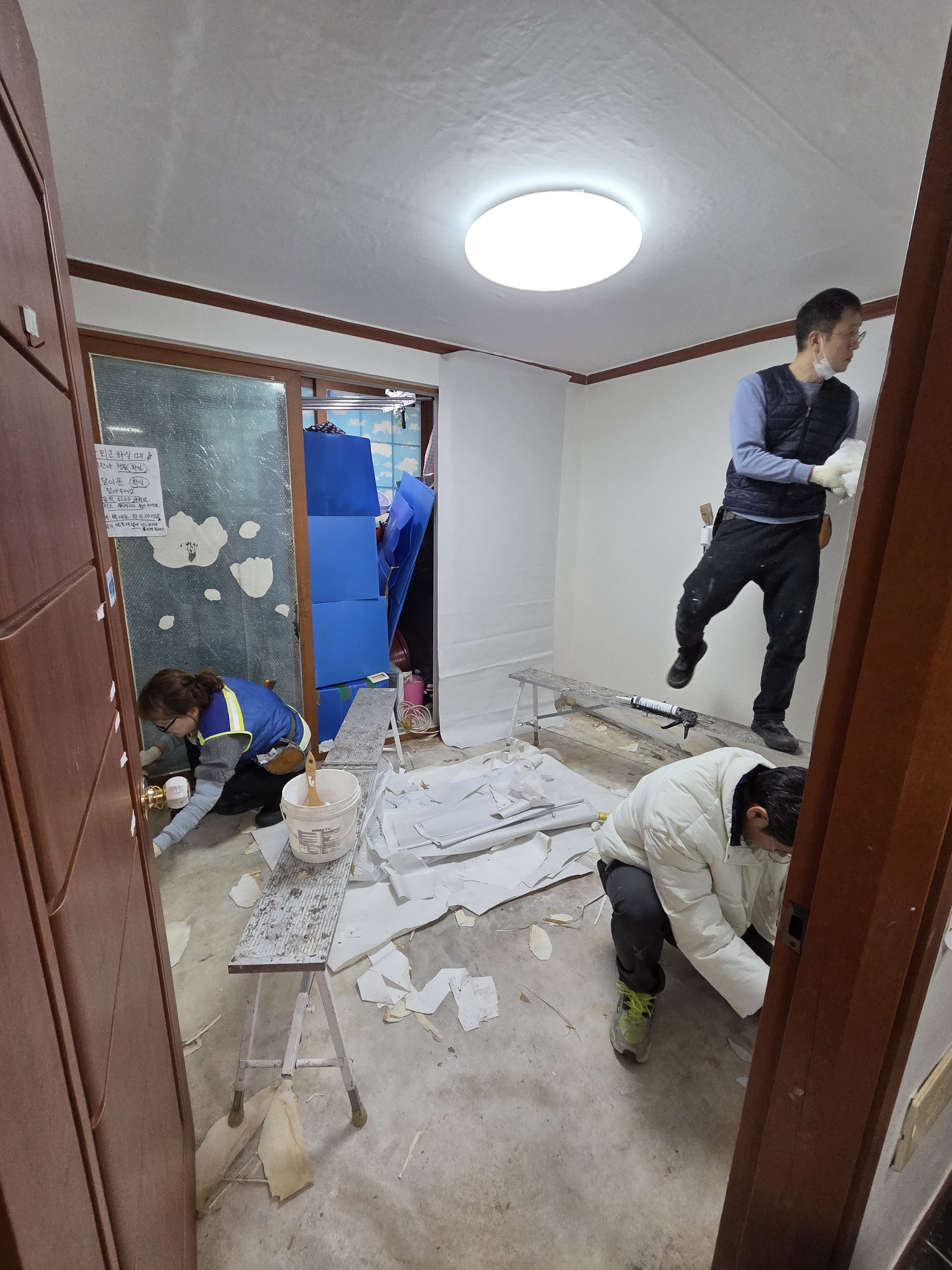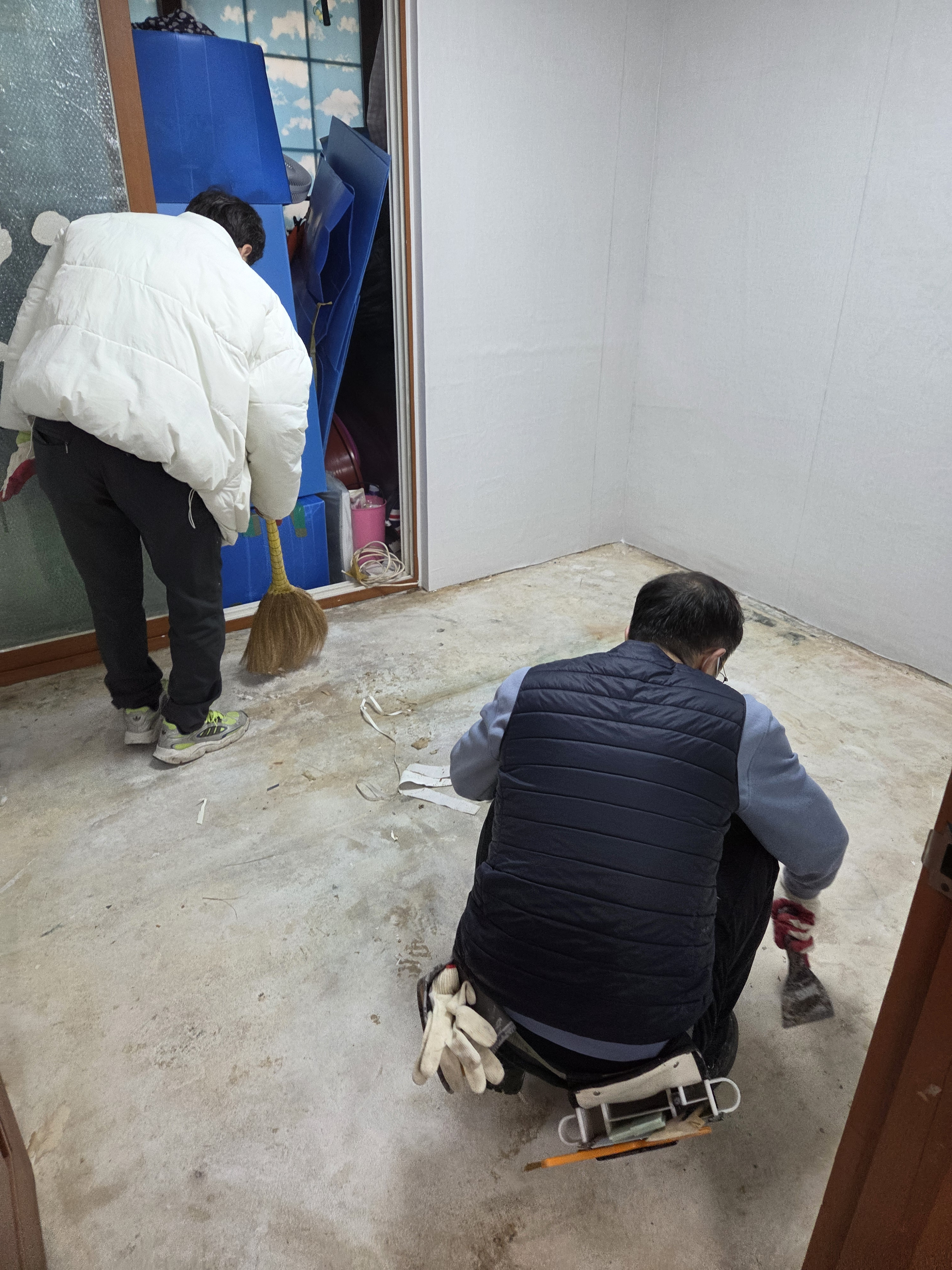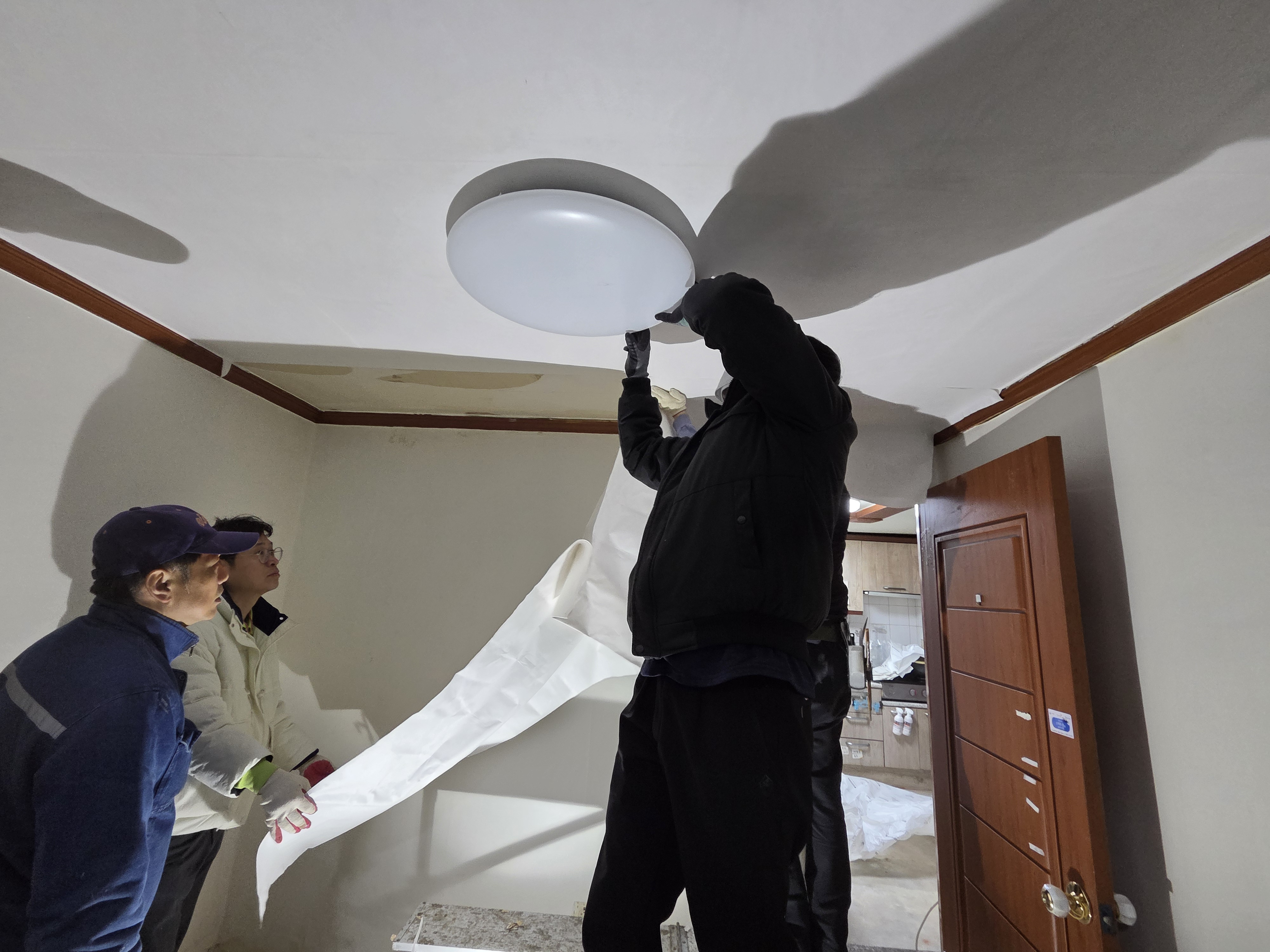 할머니가 누워계시는 방은 누수가 없어서 누수가 난 방 도배/장판과 거실 장판 작업. 그리고 화장실 천정 도배를 진행했습니다.