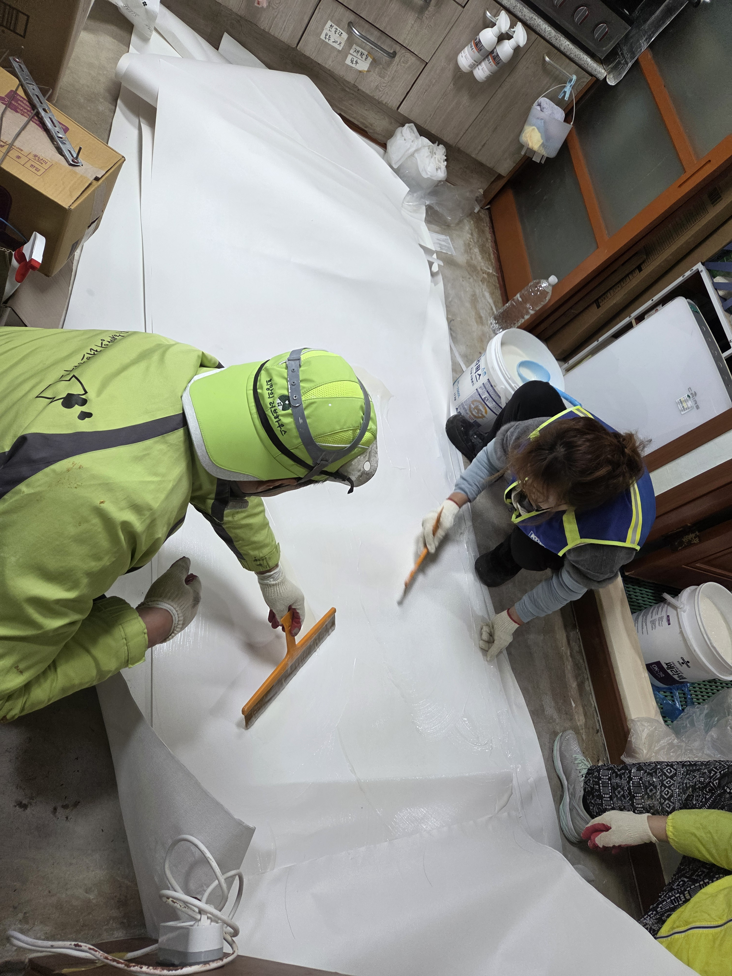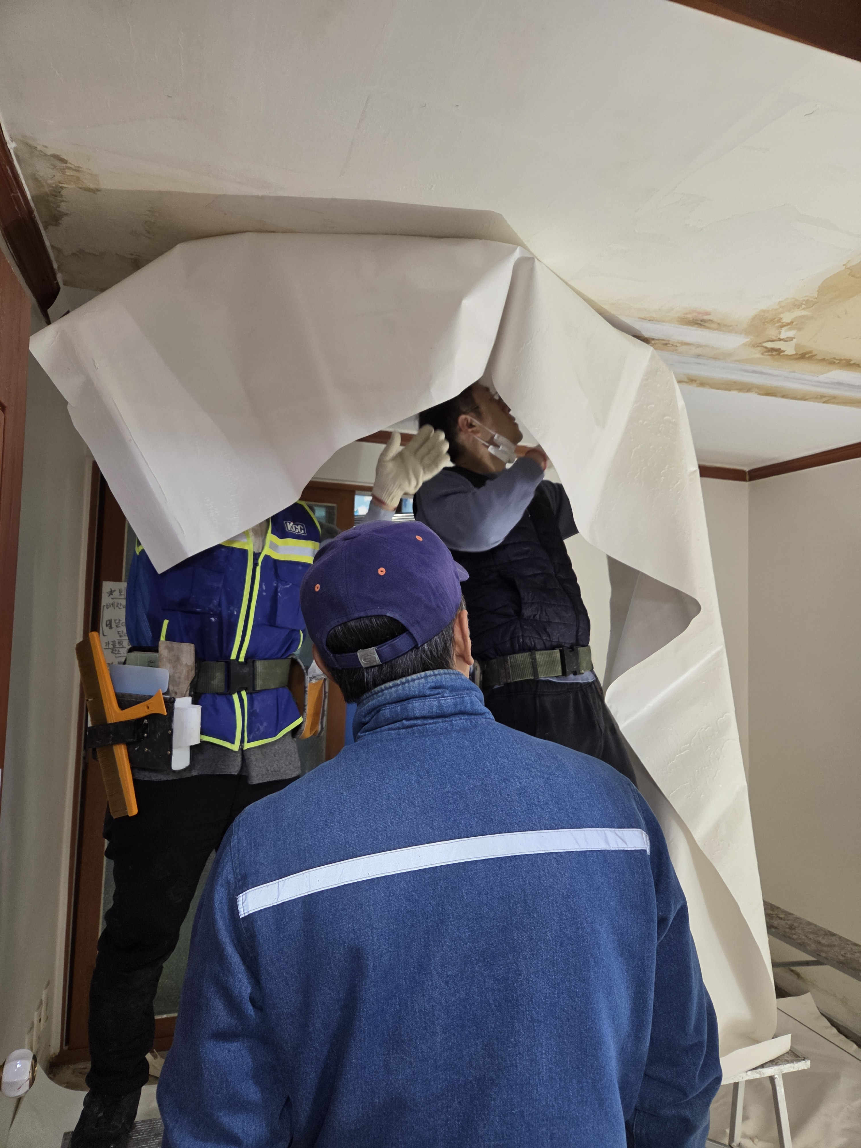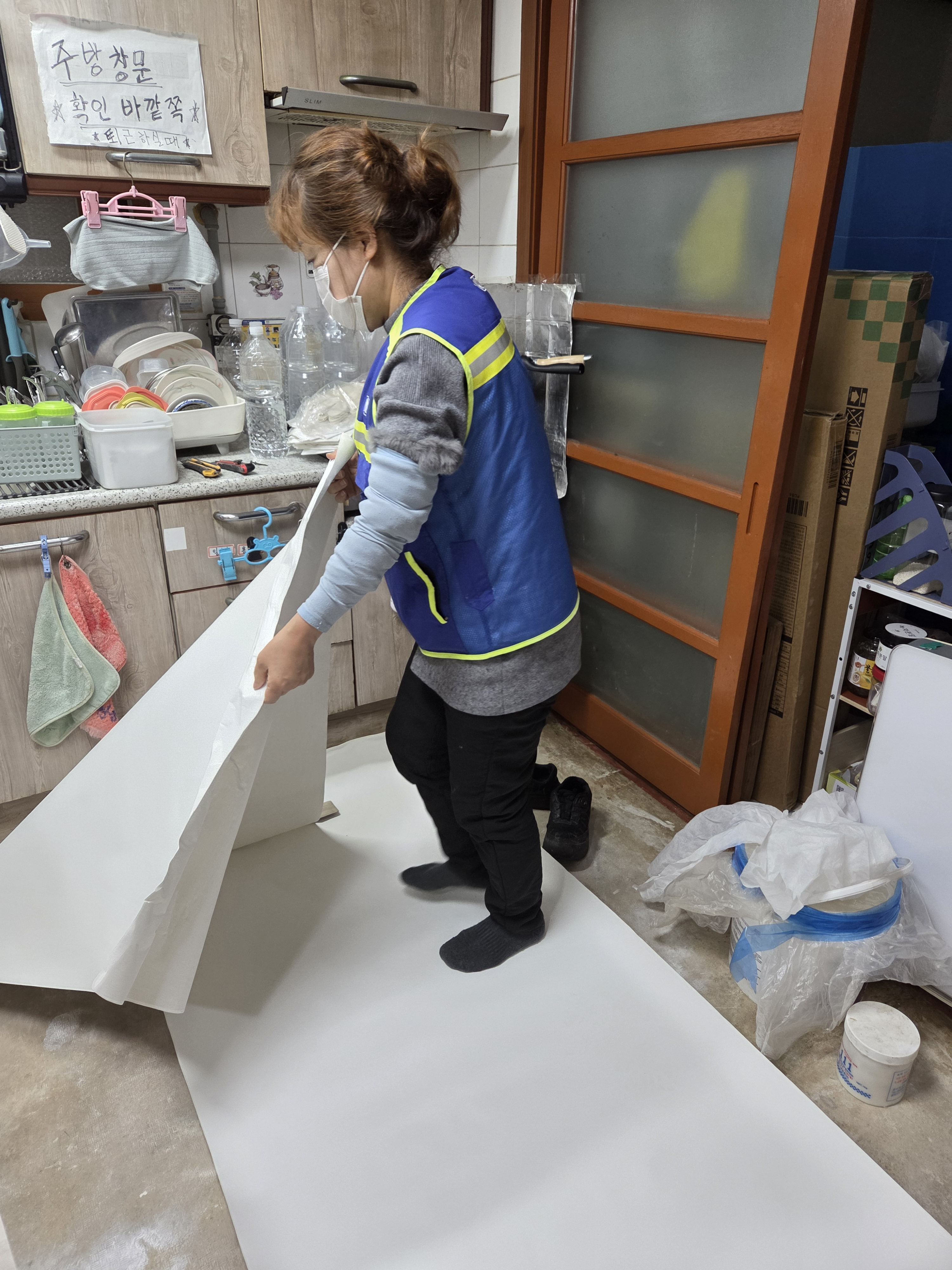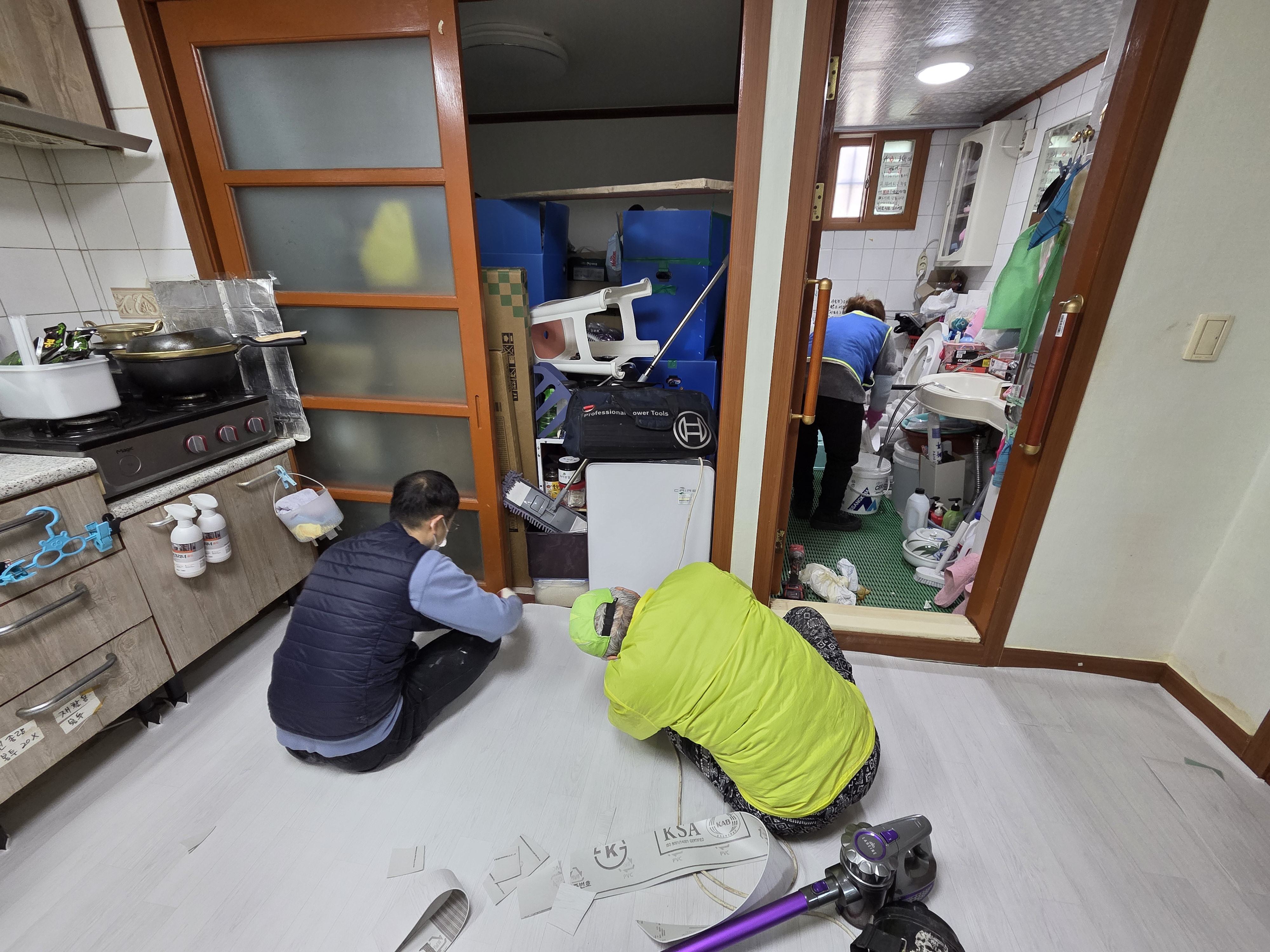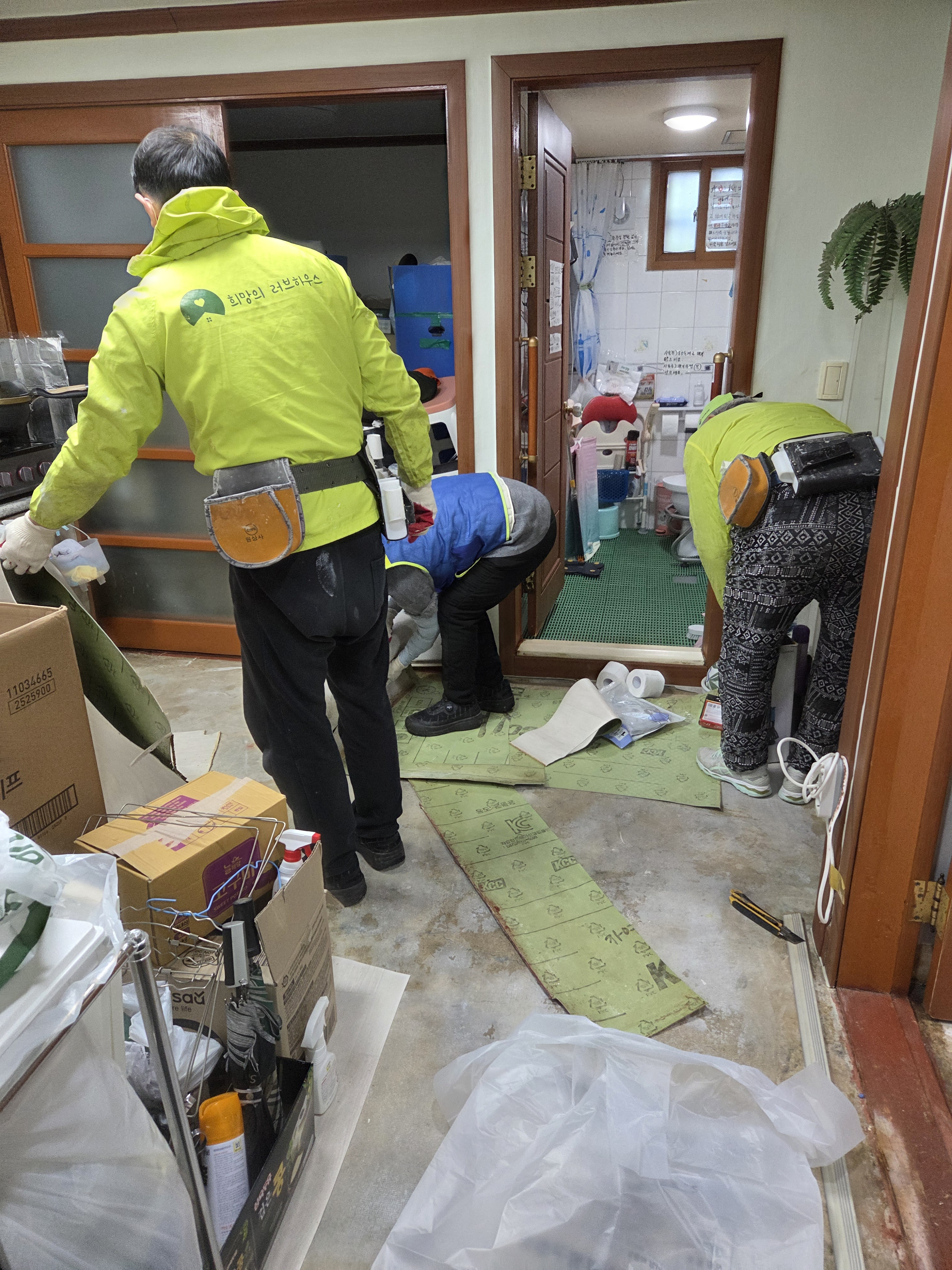 할머니가 누워계시는 방은 누수가 없어서 누수가 난 방 도배/장판과 거실 장판 작업. 그리고 화장실 천정 도배를 진행했습니다.