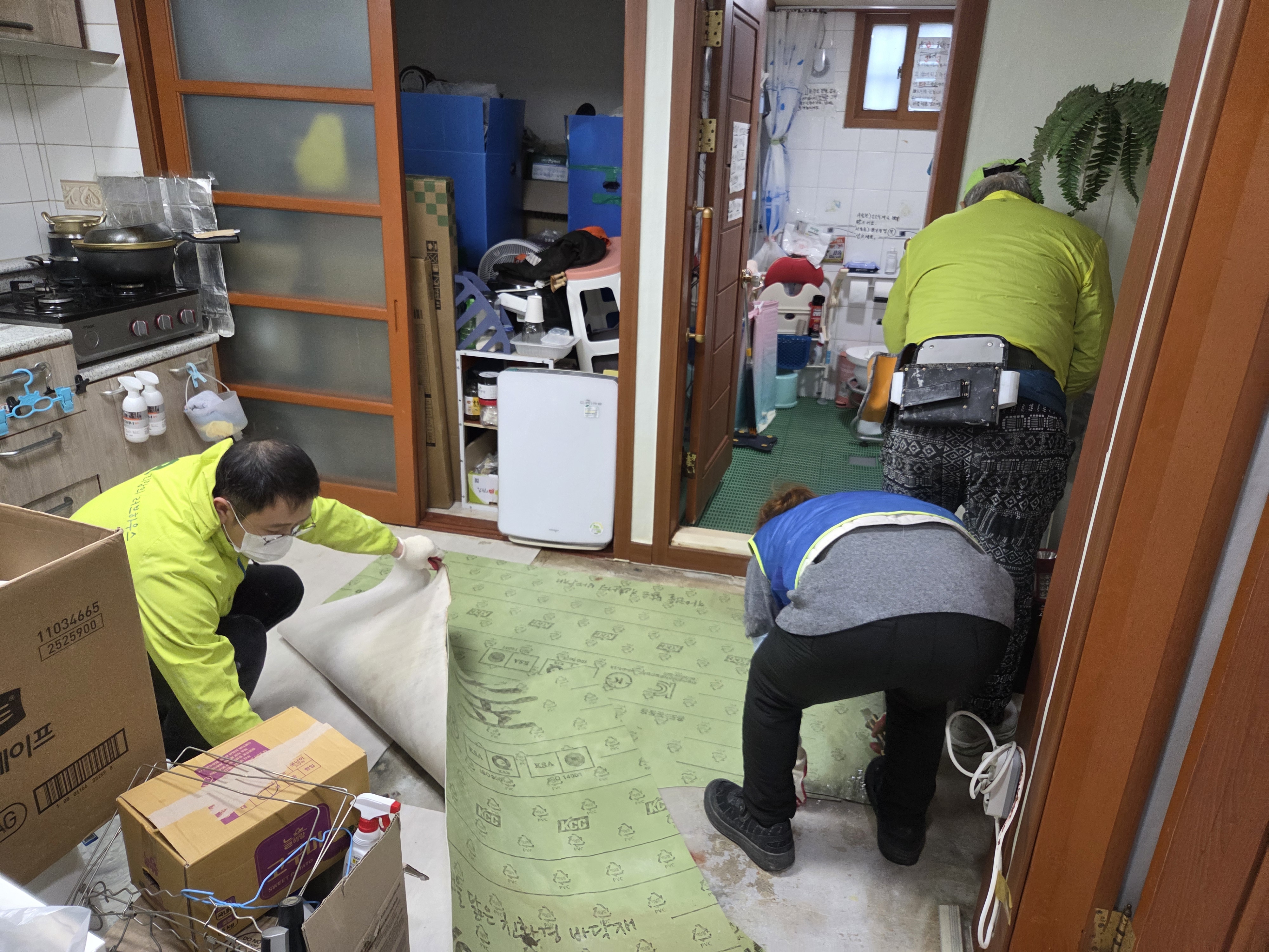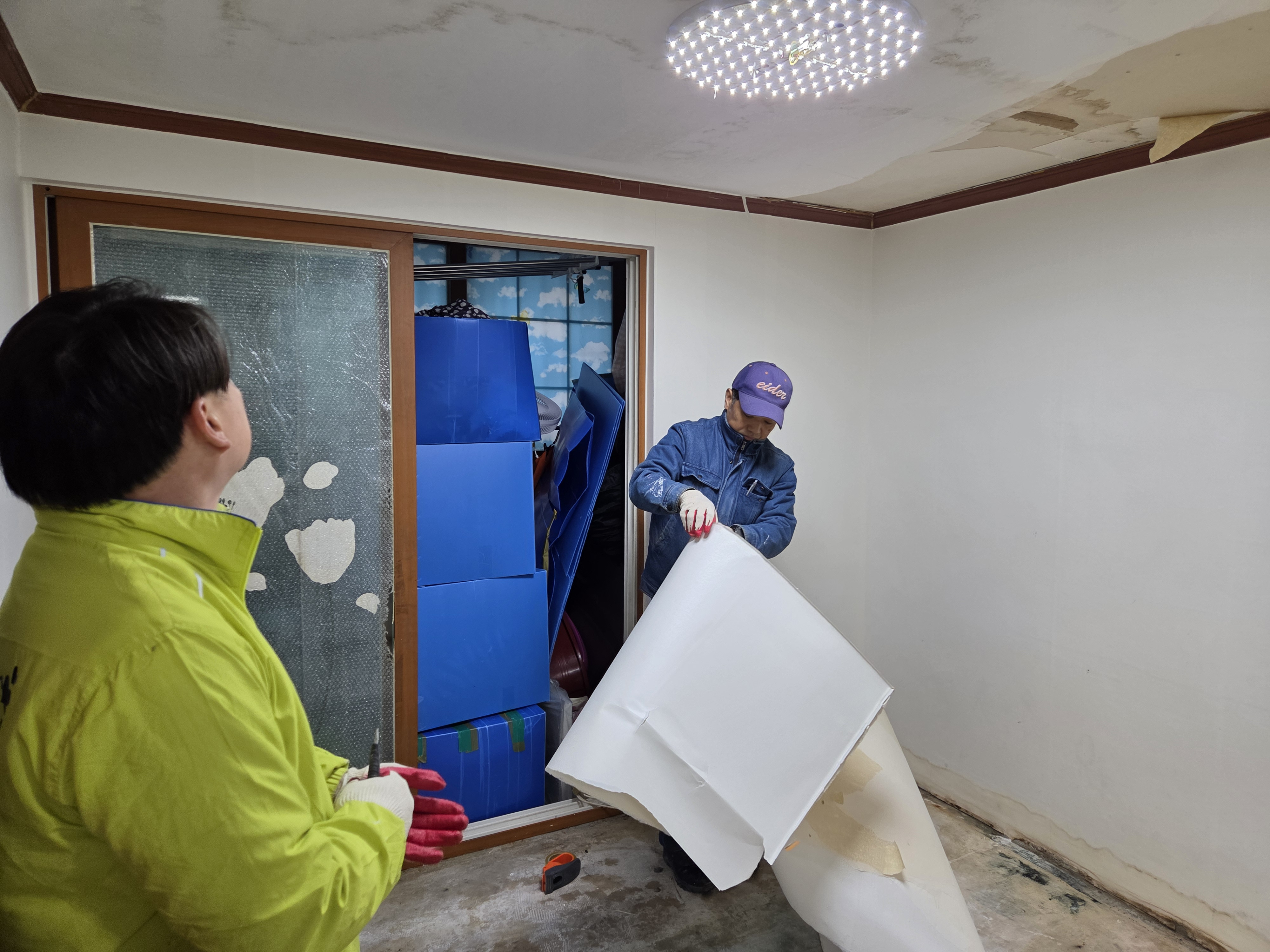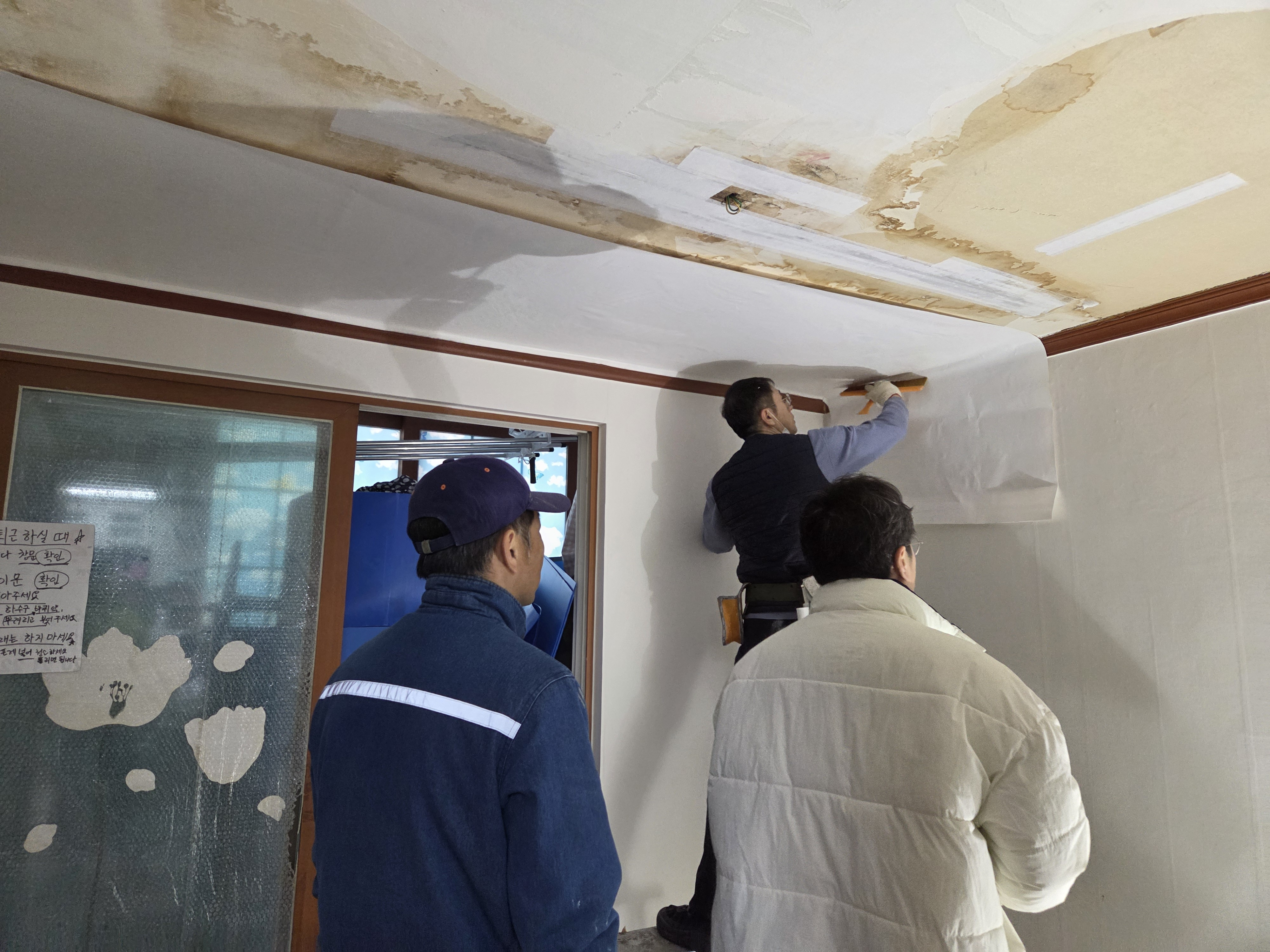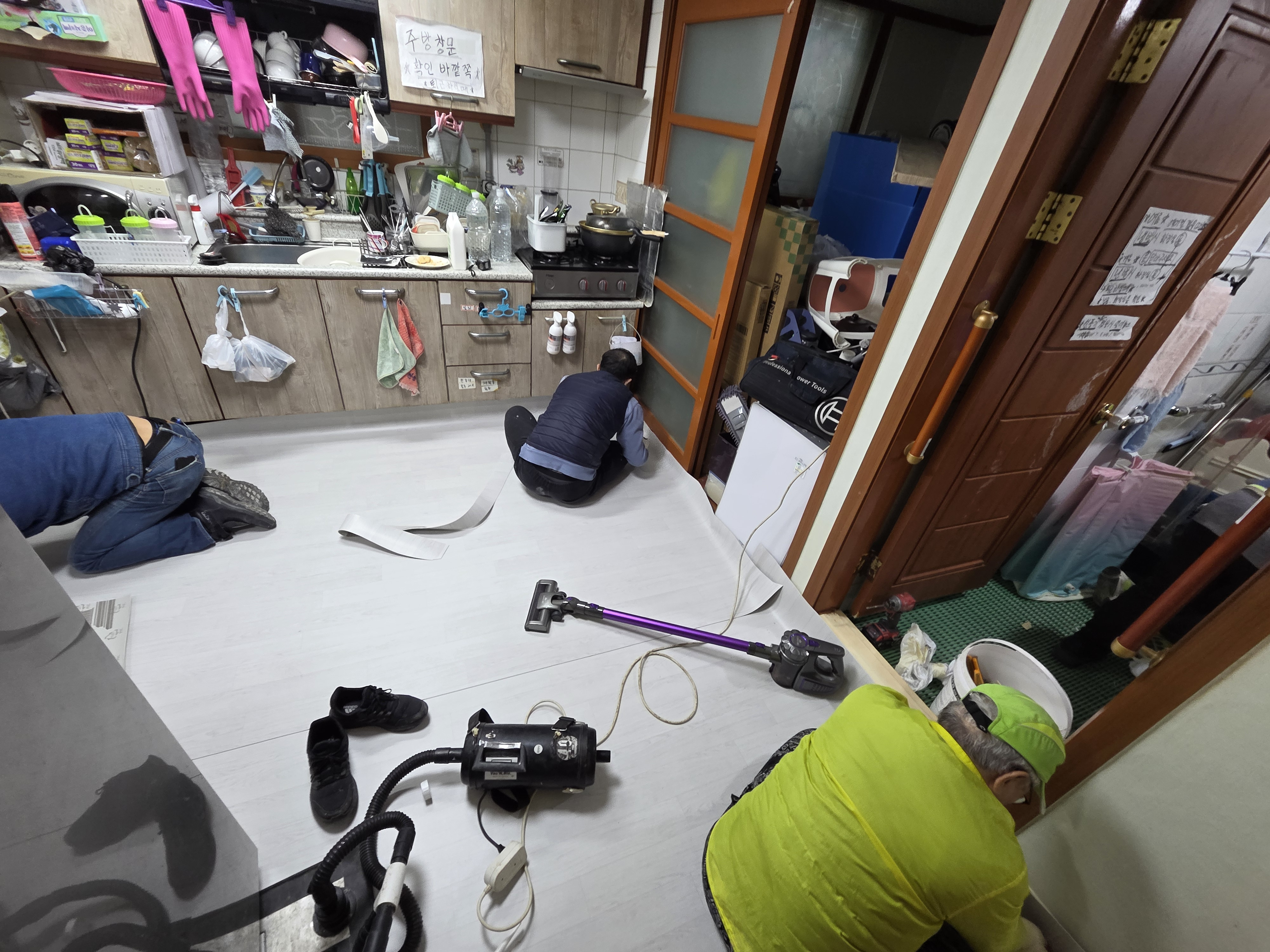 할머니가 누워계시는 방은 누수가 없어서 누수가 난 방 도배/장판과 거실 장판 작업. 그리고 화장실 천정 도배를 진행했습니다.