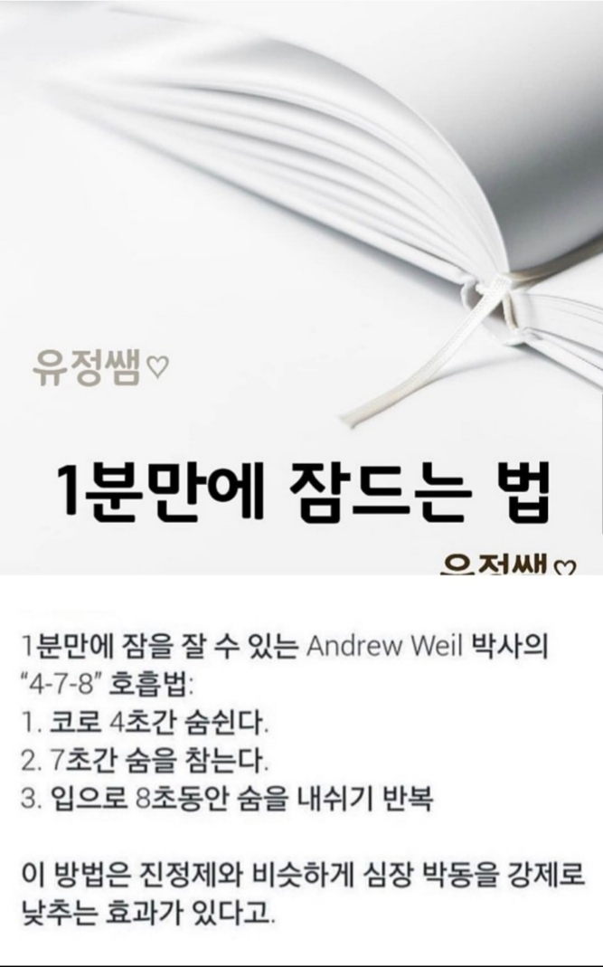 1분만에 잠드는 법 작성자오비이락|작성시간19.06.12|조회수142 목록 댓글 0 글자크기 작게가 글자크기 크게가 불면증 있는분들은 참고하세요 다음검색 현재 게시글 추가 기능 열기 북마크 공유하기 신고 센터로 신고 댓글 댓글 0 댓글쓰기 답글쓰기 댓글 리스트