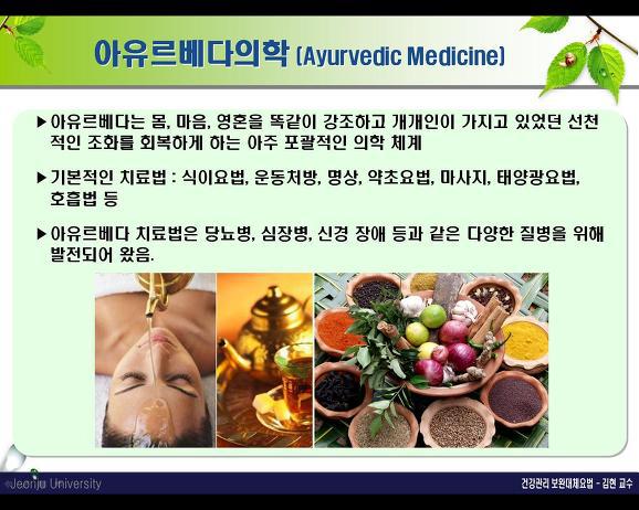 미국 등 서구에서도 아유르베다는 상당한 인기를 끌고 있지만 우리나라에서는 아유르베다에 대한 체계적 연구나 관리, 관심도 등에서 초보적인 단계에 머물고 있습니다.