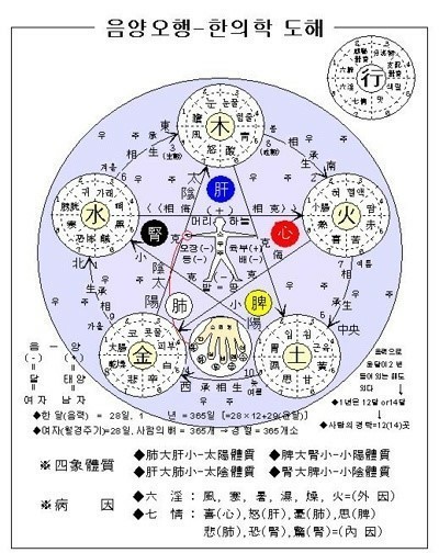 우리가 흔히 병원에서 잘 낫지 않는 병에 속하는 것이 바로 오행이 순환하지 않아서 생기는 질환들이 거기에 속합니다.사주에 어느 오행이 너무 많아서 생기는 질병도 있습니다. 그러나 대부분 억제를 당하여 생기는 질환이 더 많습니다.기운이 딸리고 쉽게 피로하는 만성피로 같은 경우에는 주로 신장이나 방광이 약해서 생기는 질환입니다.