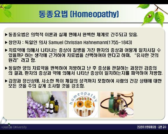 18세기 후반 독일의 의사 사무엘 하네만 (Samuel Hahnemann)이 창시한 대체 의학으로, 쉽게 말하면 같은 것이 같은 것을 치료한다는 믿음으로 하는 치료이다.