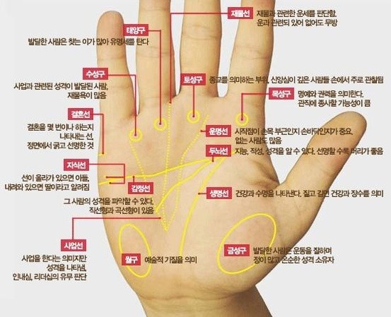 손바닥의 여러 가지 선의 모양이나 종류로 당신의 결혼운, 직업, 성격, 건강 상태를 알 수 있다.