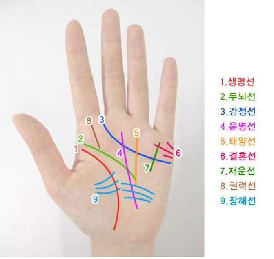 1). 생명선 : 생명선은 사람의 건강과 수명을 나타내는데, 깊고 선이 분명하거나 살빛보다 짙고 끊긴데가 없이 길어야 좋습니다. 이 선이 짧거나 중간에 끊기면 좋지 않고 희미하거나 얇거나 넓으면 건강에 지장이 있습니다. 또한 생명선이 끊어질 듯 이어진것은 죽을 고비를 넘겼다는 증거입니다. 여러 군데 끊겼다가 이어지면 여러 차례 액을 넘겼다는 표시입니다.