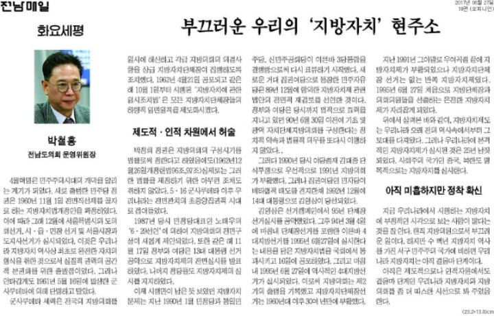 우리나라 지방자치는 이제 20년 조금 넘은 걸음마 단계이고 과도기적 현상에 있다. 50, 60년대에 지방의회만 부분적으로 실시했지만 제대로 된 지방자치라고 볼 수 없다.