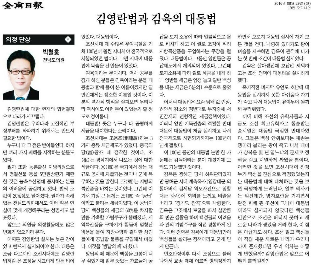 아랫 글은 김영란법이 막 제정되었을 때 광주전남 일간지에 제가 기고한 칼럼입니다. 김육과 대동법에 대해 자세히 써 져 있어 그대로 올립니다.