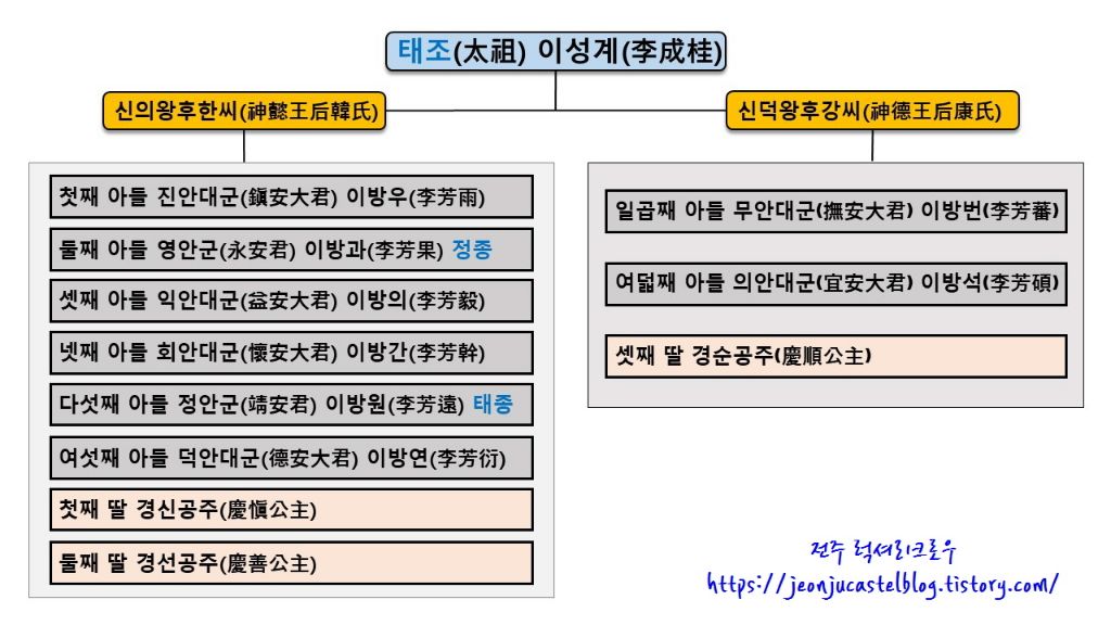 이 아들 중 이방원이야 모르는 사람들이 거의 없을 것이다. 후에 정종이 되는 이방과나 제 2차 왕자의 난을 일으킨 이방간은 들어는 봤을 것이다.