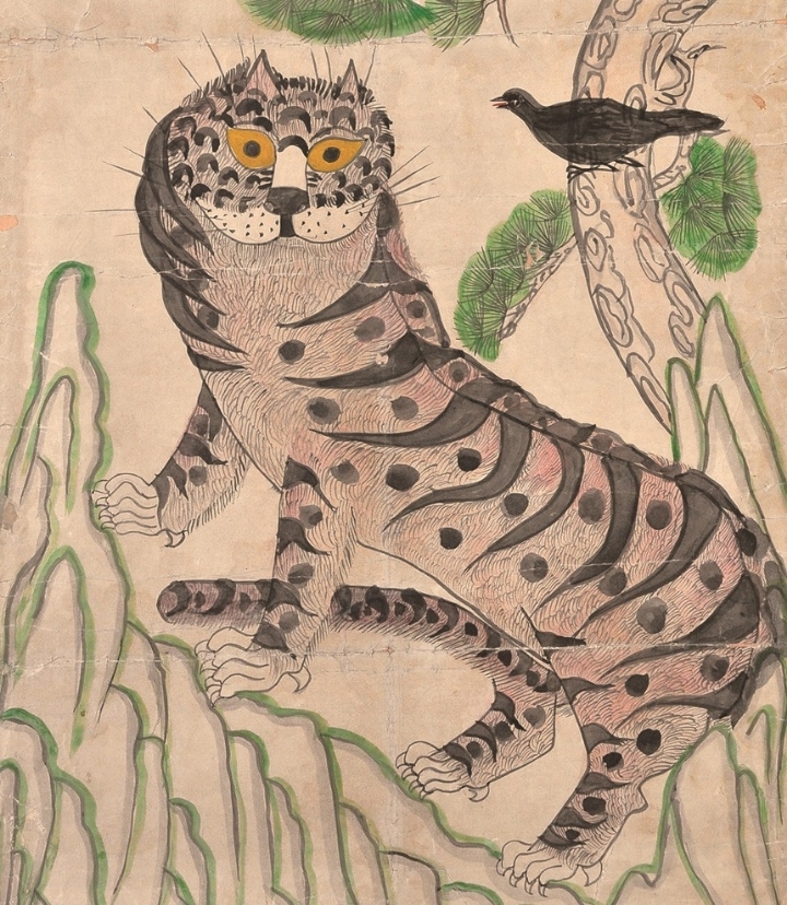 이러한 중국과 달리 조선에서는 호랑이에 높은 관직을 상징하는 의미는 없습니다. 호랑이는 신선을 따라다니는 동물로 주로 좋은 소식을 가져다주는 동물을 상징했고, 그 뜻을 더욱 분명히 하기 위해 까치를 소나무 위에 그려 넣었어요. 까치는 당시에도 전통적으로 좋은 소식을 전하는 길조(吉鳥)의 새로 알려져 있었거든요.