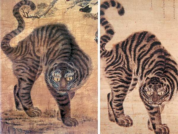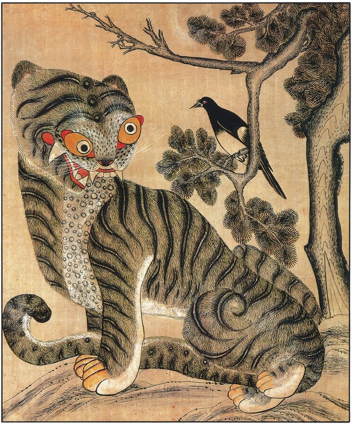 얼굴도 전혀 호랑이를 닮지 않았고 표정도 우스꽝스럽지요. 얼굴만 보면 호랑이가 아니라 표범을 그린 것 같기도 합니다.