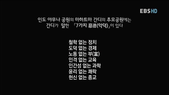 인도의 성인(聖人) 마하트마 간디(Mahatma Gandhi 1869~1948)가 인도의 지도자로서 부상하면서 인도 독립운동에 투신할때인 1925년 <Young India> 라는 주간 신문매체를 통해 일곱가지의 사회도덕적 잘못(죄악)들을 지적, 갈파하였다. 이는 현대사회의 모순된 현실들을 비판하고 성찰하라는 경계(警戒)이고 명언(名言) 이다.