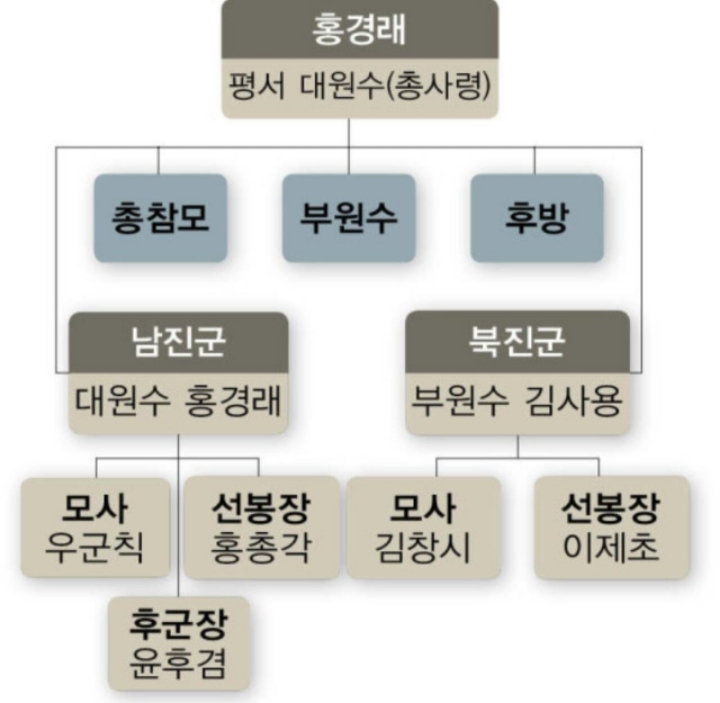 홍경래(洪景來)는 봉기에 앞서 부서를 정했다. 자신은 평서대원수가 되고 부원수로 김사용을 임명했으며, 총참모는 우군칙, 부참모는 김창시(金昌始)가 맡게 되었다.