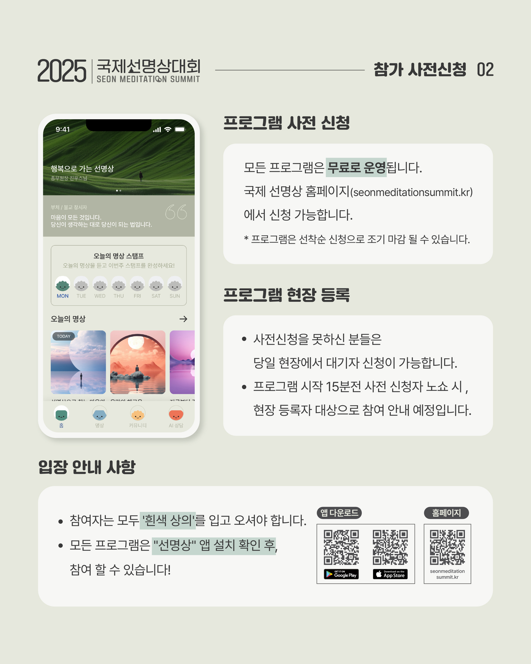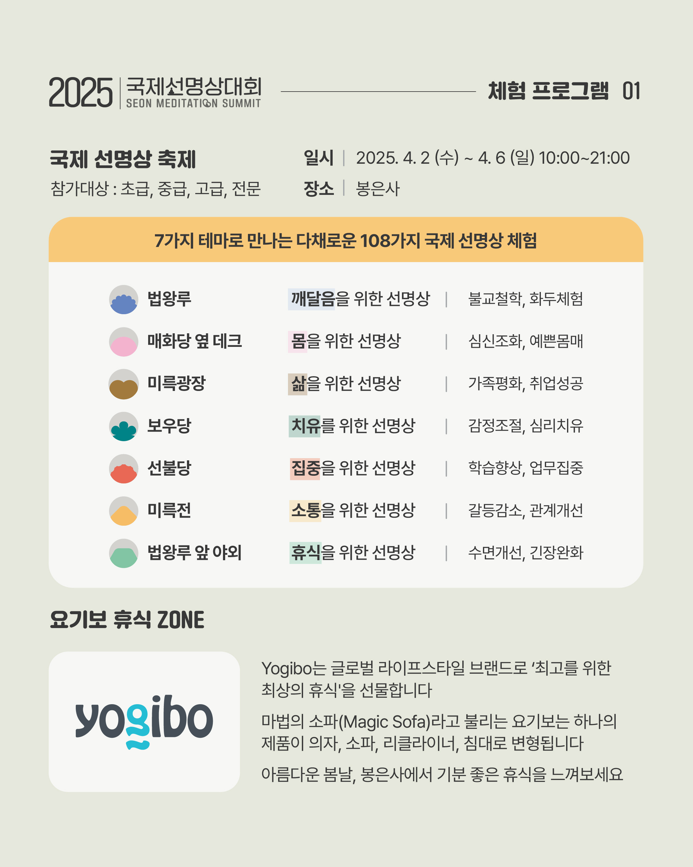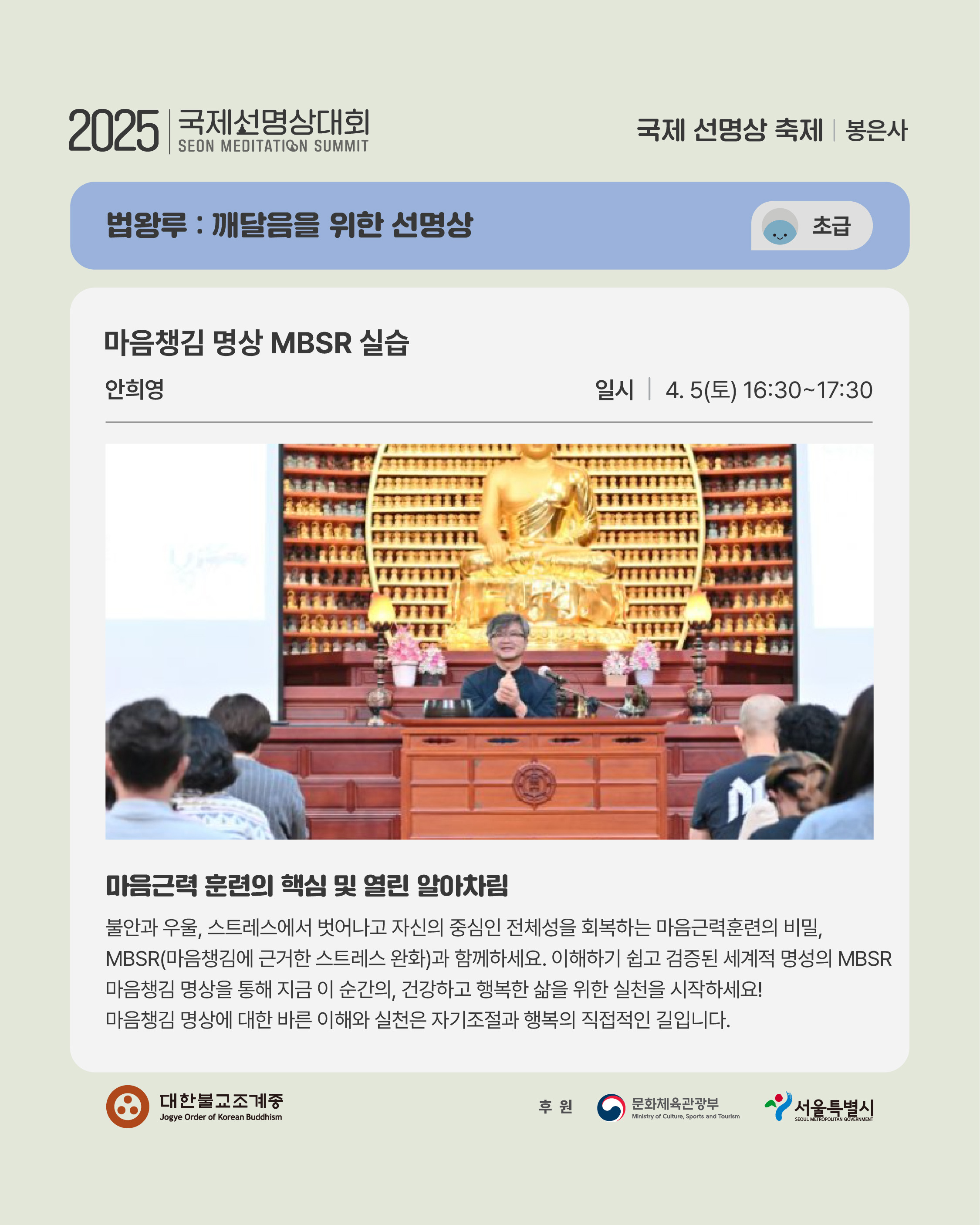 4월 2일(수)부터 4월 6일(일)까지 봉은사(서울시 강남구 삼성동)에서 국제선명상축제가 진행됩니다. 국민 누구나 경험할 수 있는 다양한 선명상 프로그램 보급과 대중화를 위해 마련된 이번 국제선명상축제에서는 108가지의 다양한 프로그램이 무료로 운영됩니다. 평소 MBSR에 대해 궁금하셨던 분들, 현장에서 안희영 소장님 강연을 듣고 싶으셨던 분들 등 많은 참여와 응원 부탁드리며, 그 외 준비되어 있는 다양한 프로그램도 참가해보시며 이번 행사의 이름처럼 명상을 즐길 수 있는 진정한 축제의 장이 되기를 바랍니다.
