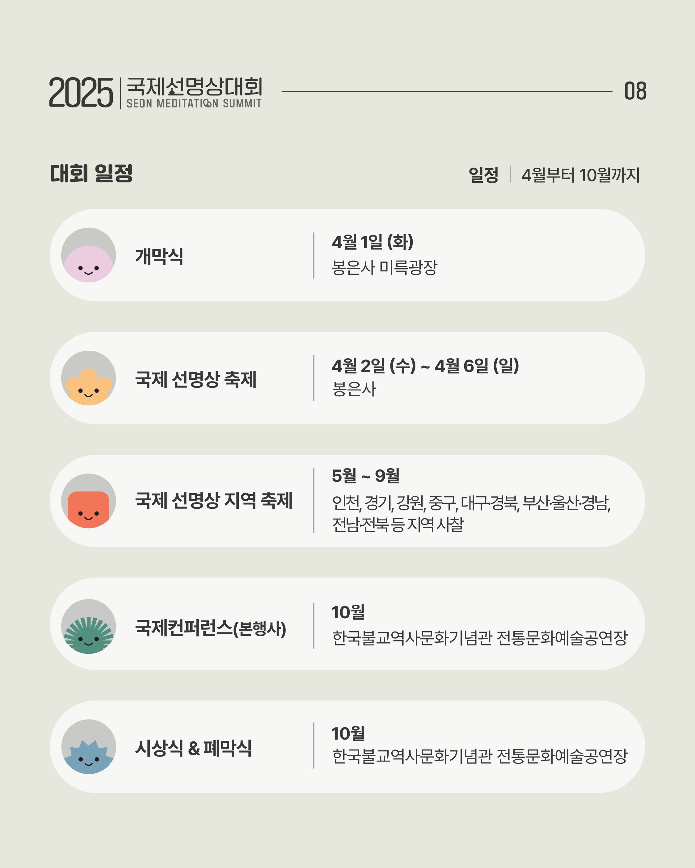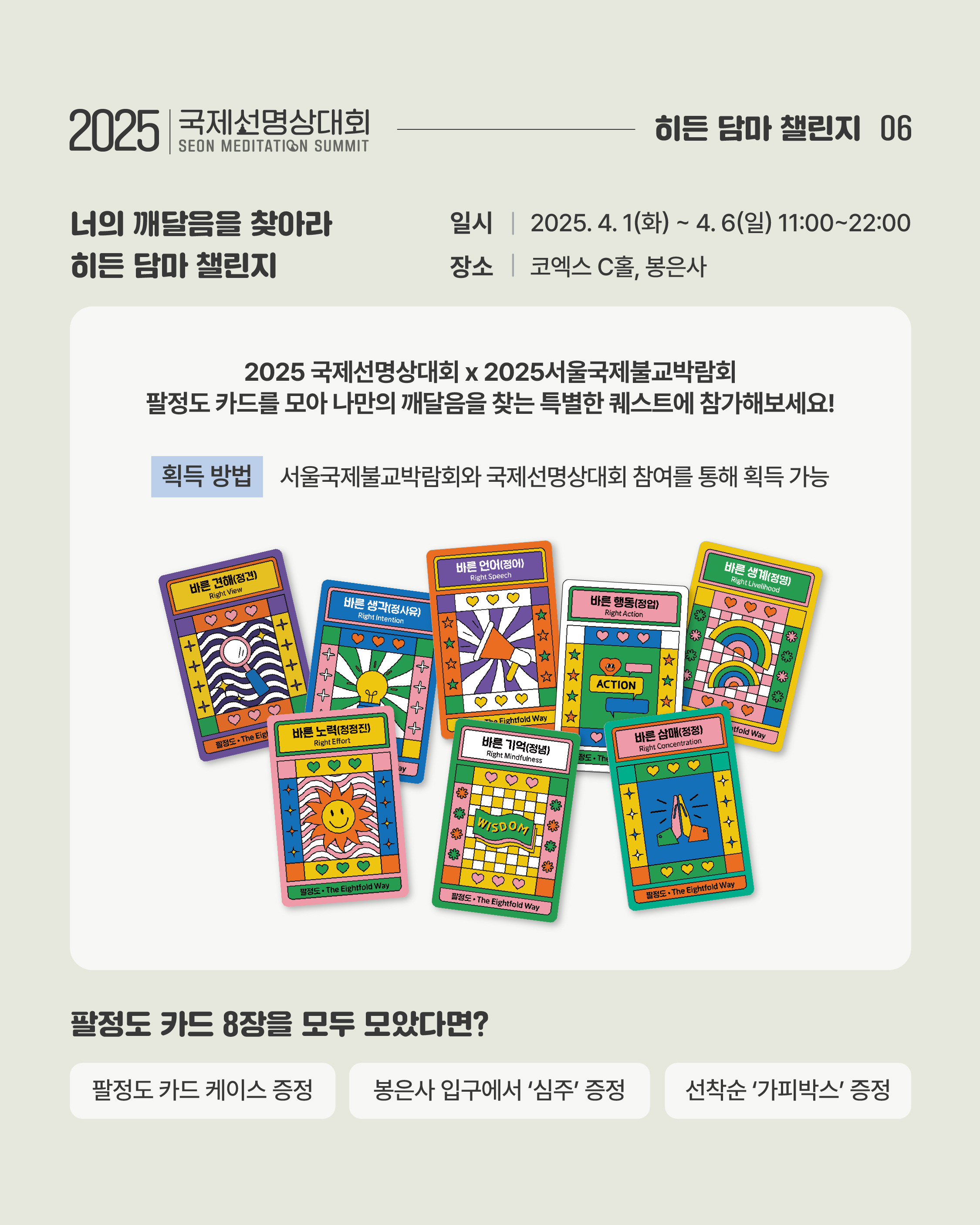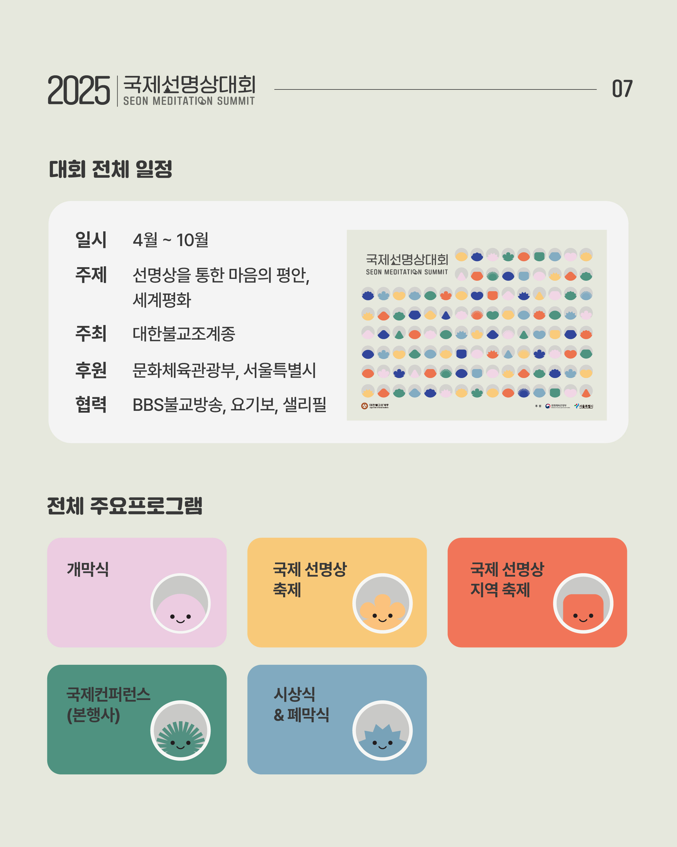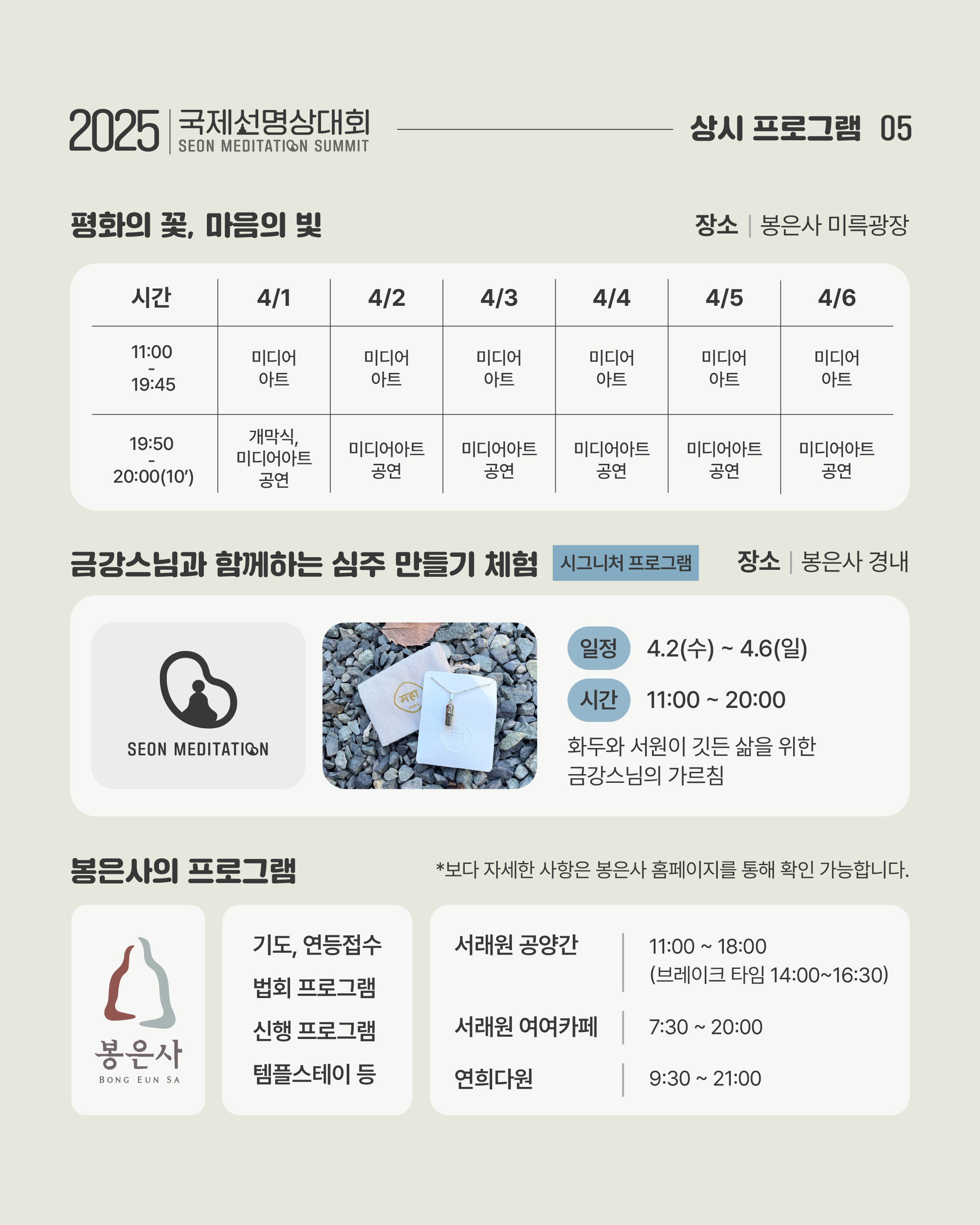 4월 2일(수)부터 4월 6일(일)까지 봉은사(서울시 강남구 삼성동)에서 국제선명상축제가 진행됩니다. 국민 누구나 경험할 수 있는 다양한 선명상 프로그램 보급과 대중화를 위해 마련된 이번 국제선명상축제에서는 108가지의 다양한 프로그램이 무료로 운영됩니다. 평소 MBSR에 대해 궁금하셨던 분들, 현장에서 안희영 소장님 강연을 듣고 싶으셨던 분들 등 많은 참여와 응원 부탁드리며, 그 외 준비되어 있는 다양한 프로그램도 참가해보시며 이번 행사의 이름처럼 명상을 즐길 수 있는 진정한 축제의 장이 되기를 바랍니다.