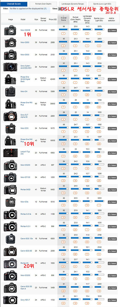DXOmark(http://www.dxomark.com/)에서 지금 출시된 대부분의 센서와 렌즈에 대해 테스트해서 결과를 정리해 둔 것을 보면, 객관적으로 각종 센서의 성능을 비교해 볼 수 있습니다. 여기서는 DXOmark의 데이터를 가지고 비교해 보도록 하겠습니다.