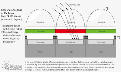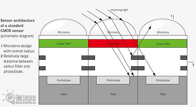 라이카의 기술문서에 따르면 전통적인 설계의 마이크로 렌즈는 그 성능이 매우 한정되어 있다는 것을 알 수 있습니다. 비스듬한 각도로 들어오는 빛은 센서에서 빛을 받지 못하는 구역으로 들어가는 일이 비일비재합니다(위 사진).