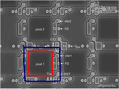 지금 Chipworks는 니콘 D4의 센서를 예로 들어서 설명하고 있는데요. 픽셀-화소라고 표시한 빨간색 정사각형이 CMOS에서 감광-빛을 받아 반응하는- 구역입니다.