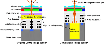 (최근 후지필름은 빛의 입사광을 향상시킨유기CMOS센서를 개발하였는데 파나소닉 반도체에서 생산되며 파나소닉의 마포그룹은 앞으로 후지의 유기센서를 쓸 예정입니다.)