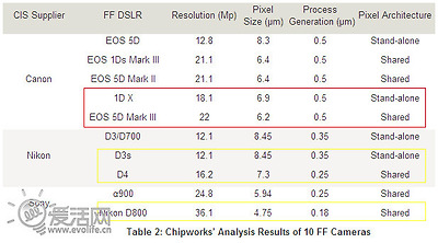 경쟁자 니콘제품과 비교를 해보면 니콘 이전 세대 플래그쉽인 D3X는 250nm 공정을 쓰며, 최신 보급형 풀프레임인 D600은 180nm를 씁니다.