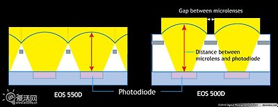 마이크로 렌즈를 개선할 때마다 센서의 성능은 상당한 발전을 이루게 됩니다. 캐논은 500D에서 550D로 업그레이드하면서 마이크로 렌즈의 변화를 이렇게 묘사했습니다.